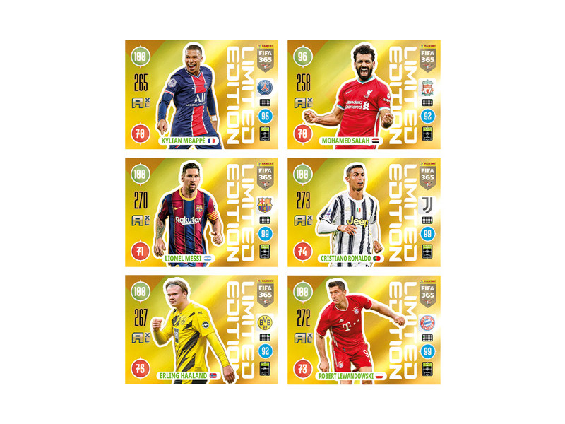 LES CARTES "LIMITED EDITION" 29 au lancement de la collection Pack de démarrage (2 cartes) Sergino Dest (FC Barcelona) Diogo Jota (Liverpool) Offre "bundle" avec boîte de 36 pochettes (4 cartes) Weston McKennie (Juventus) Rodrygo (Real Madrid CF) Leroy Sane (FC Bayern München) Donny van de Beek (Manchester United) ----- Antony (AFC Ajax ) Edinson Cavani (Manchester United) Douglas Costa (FC Bayern München) Philippe Coutinho (FC Barcelona) Erling Haaland (Borussia Dortmund) Achraf Hakimi (FC Internazionale Milano) Eden Hazard (Real Madrid CF) Moise Kean (Paris Saint-Germain) Mohammed Kudus (AFC Ajax ) Dejan Kulusevski (Juventus) Roberto Lewandowski (FC Bayern München) Kylian Mbappe (Paris Saint-Germain) Lionel Messi (FC Barcelona) Alvaro Morata (Juventus) Martin Odegaard (Real Madrid CF) Cristiano Ronaldo (Juventus) Carlos Tevez (Boca Juniors) Lucas Torreira (Atlético de Madrid) Mohamed Salah (Liverpool) Alexis Sanchez (FC Internazionale Milano) Raheem Sterling (Manchester City) Luis Suarez (Atlético de Madrid) Marco Verratti (Paris Saint-Germain)