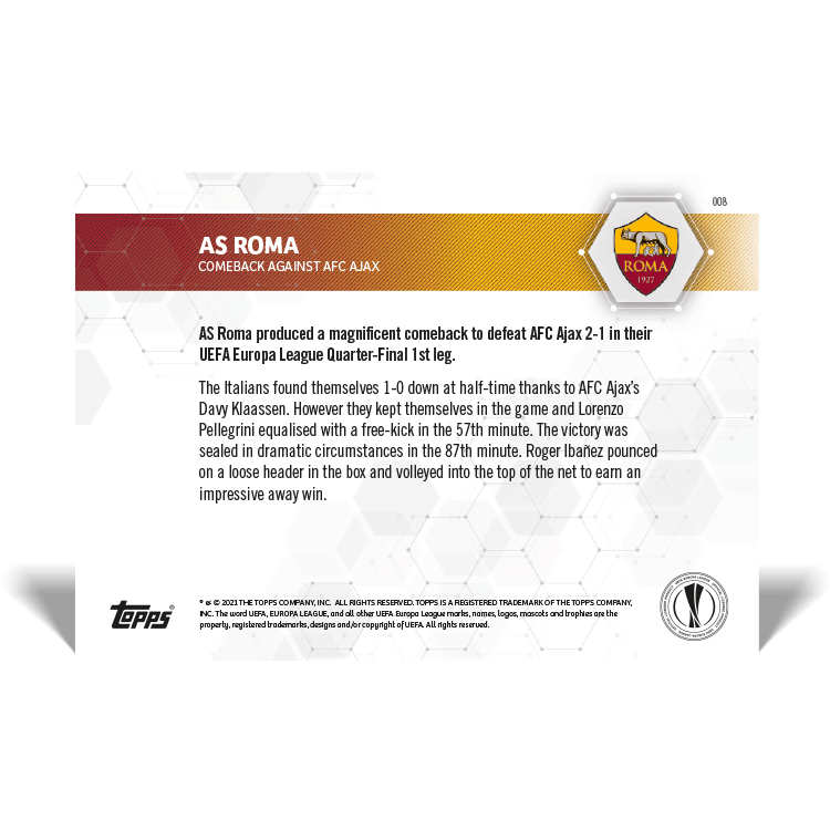 TOPPS NOW « UEFA EUROPA LEAGUE 2020/21 » : visuel des cartes 007 à 008 (quarts de finale aller du 08/04) Thierry K.14/04/202127/04/2021ACTUALITÉS, DÉCOUVERTE, EDITION LIMITÉE Navigation des articles PrécédentSuivant Partager : Cliquer pour imprimer(ouvre dans une nouvelle fenêtre) Imprimer Cliquer pour envoyer un lien par e-mail à un ami(ouvre dans une nouvelle fenêtre) E-mail Cliquez pour partager sur Facebook(ouvre dans une nouvelle fenêtre) Facebook Cliquer pour partager sur X(ouvre dans une nouvelle fenêtre) X J’aime chargement… Articles similaires