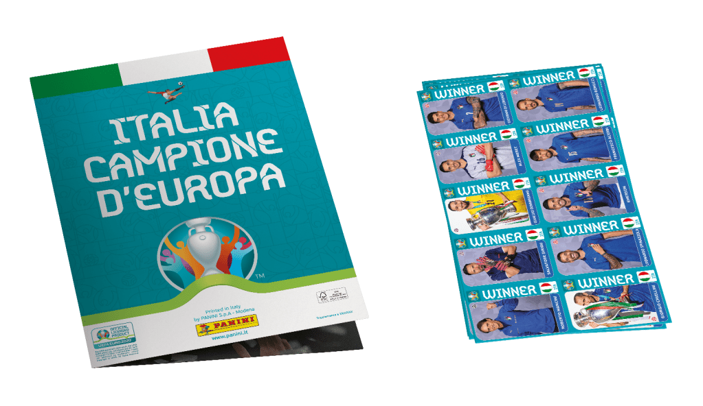 Panini commercialise un ensemble de 30 stickers, avec les membres de l’équipe nationale italienne, accompagnés d’une grande affiche revenant sur les matchs qui ont mené la Squadra Azzurra jusqu’à la finale à Londres et ce titre de championne d’Europe.