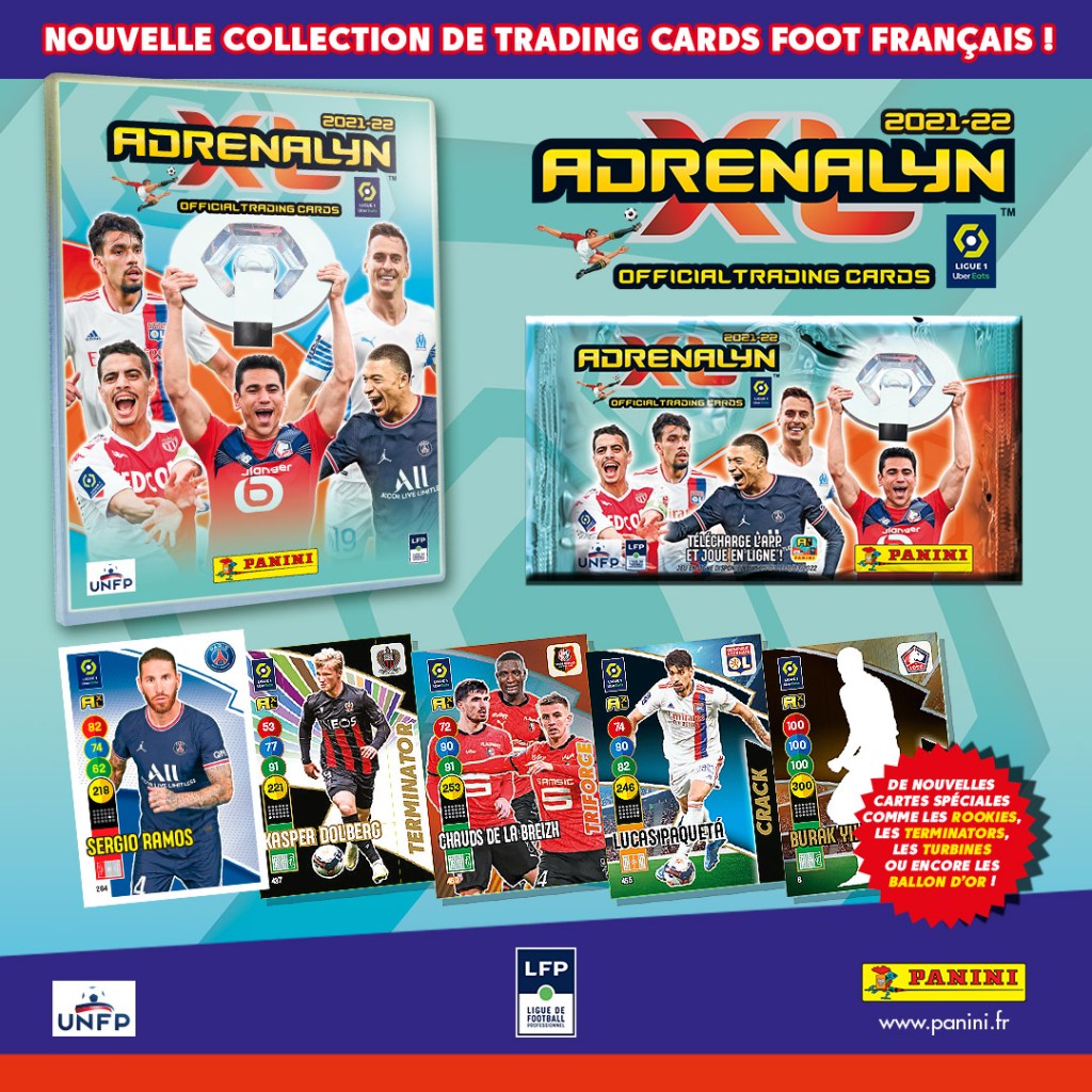Panini vient d’annoncer, sur ses réseaux sociaux, la nouvelle collection de cartes LIGUE 1 UBER EATS ADRENALYN XL 2021-22 en précommande. C’est l’occasion de découvrir de nouvelles rubriques, comme ROOKIE ou TERMINATOR, et surtout le visuel des cartes.