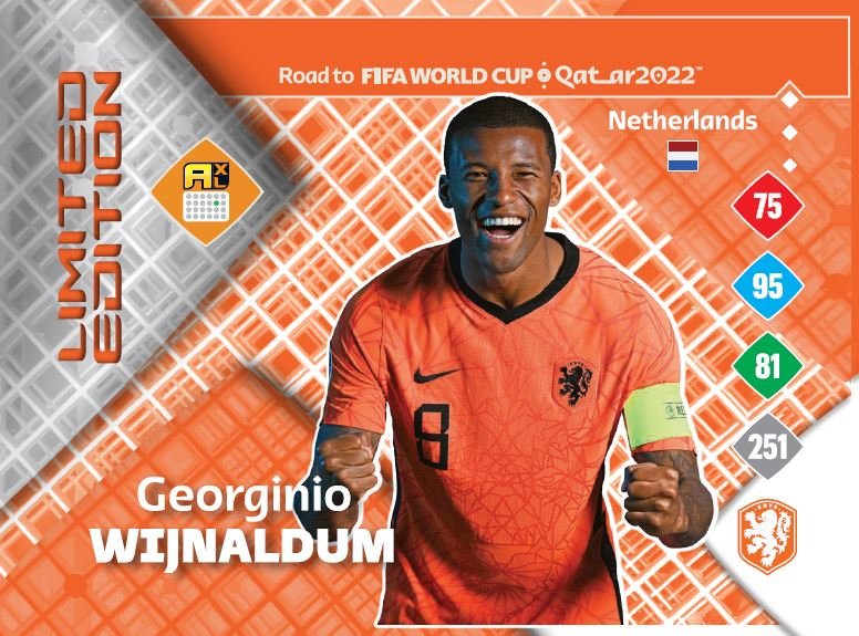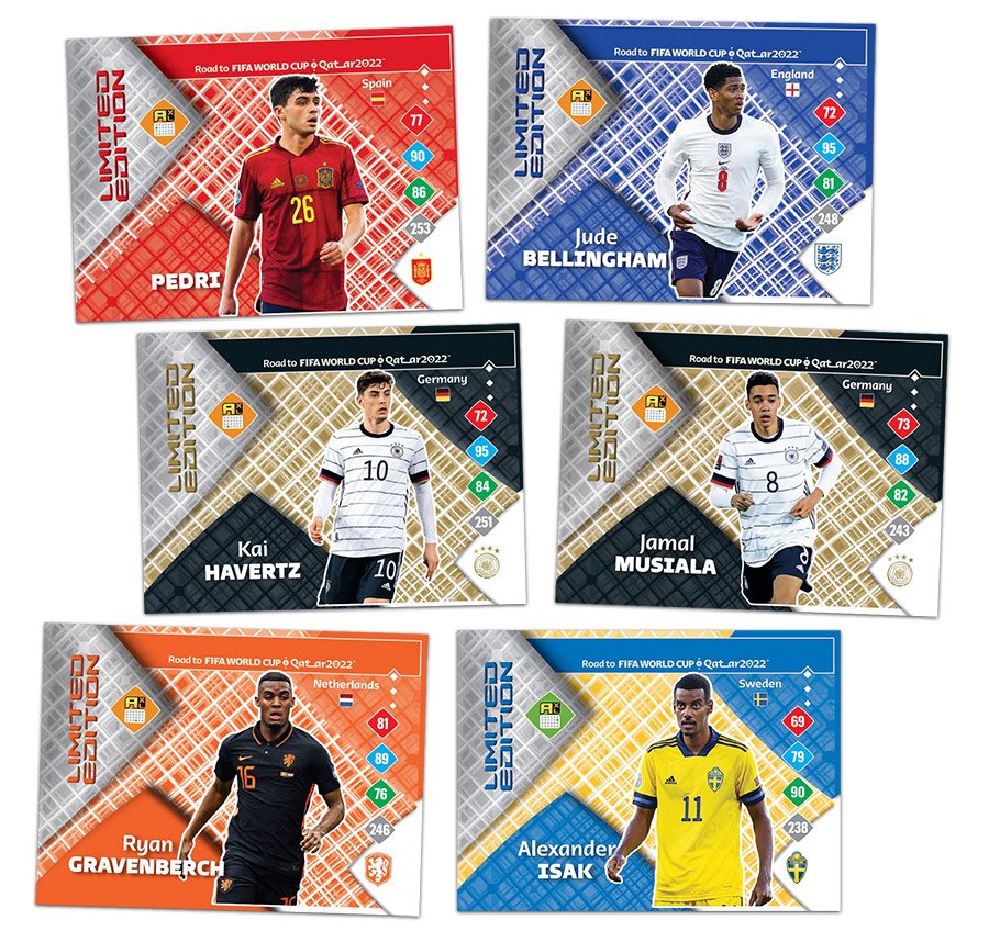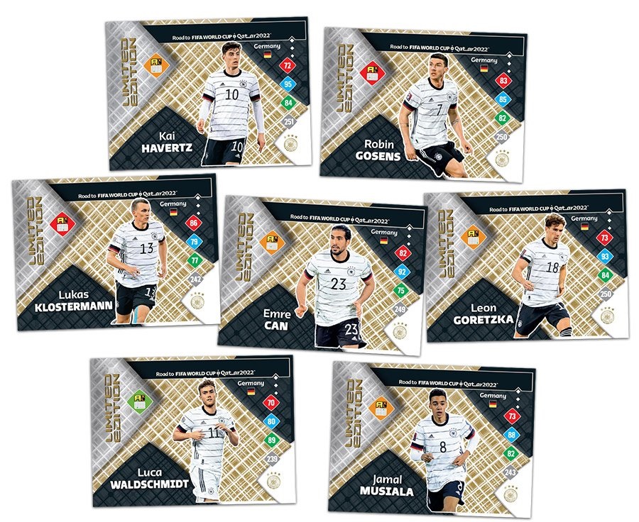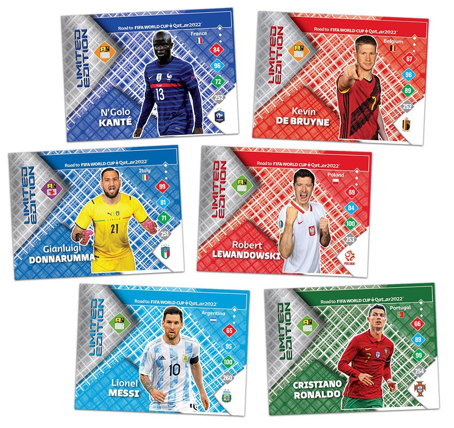 LES AUTRES CARTES "LIMITED EDITION XXL" LEXXL. Hassan Alhaydo (Qatar) LEXXL. Marko Arnautović (Austria) LEXXL. Jude Bellingham (England) LEXXL. Emre Can (Germany) LEXXL. Kevin De Bruyne (Belgium) LEXXL. Gianluigi Donnarumma (Italy) LEXXL. Roberto Firmino (Brazil) LEXXL. Leon Goretzka (Germany) LEXXL. Robin Gosens (Germany) LEXXL. Ryan Gravenberch (Netherlands) LEXXL. Kai Havertz (Germany) LEXXL. Pierre Emile Højbjerg (Denmark) LEXXL. Alexander Isak (Sweden) LEXXL. N'Golo Kanté (France) LEXXL. Lukas Klostermann (Germany) LEXXL. Robert Lewandowski (Poland) LEXXL. Riyad Mahrez (Algeria) LEXXL. Lionel Messi (Argentina) LEXXL. Jamal Musiala (Germany) LEXXL. Guilermo Ochoa (Mexico) LEXXL. Pedri (Spain) LEXXL. Cristiano Ronaldo (Portugal) LEXXL. Alexis Sánchez (Chile) LEXXL. Federico Valverde (Uruguay) LEXXL. Luca Waldschmidt (Germany) LEXXL. Denis Zakaria (Switzerland) LEXXL. Duván Zapata (Colombia)