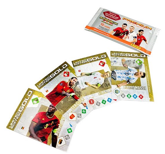 La pochette PREMIUM GOLD contient 4 cartes en édition limitée GOLD LEG. Simon Kjaer (Denmark) LEG. Romelu Lukaku (Belgium) LEG. Lionel Messi (Argentina) LEG. Sergio Ramos (Spain)