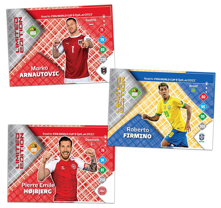 La pochette PREMIUM contient 1 carte en édition limitée aléatoire parmi 8 modèles LEP. David Alaba (Austria) LEP. Robert Lewandowski (Poland) LEP. Luis Muriel (Colombia) LEP. Neymar (Brazil) LEP. Paul Pogba (France) LEP. Marcus Rashford (England) LEP. Cristiano Ronaldo (Portugal) LEP. Marco Verratti (Italy)