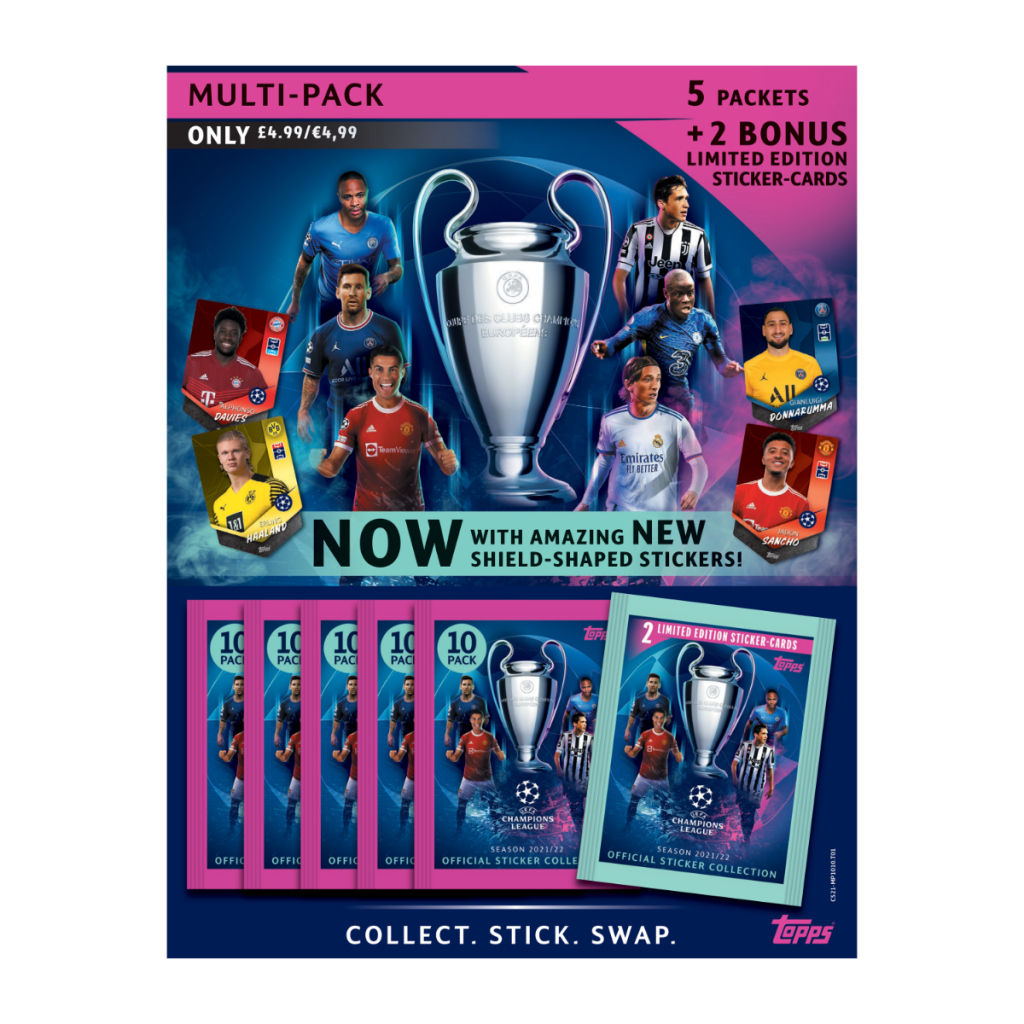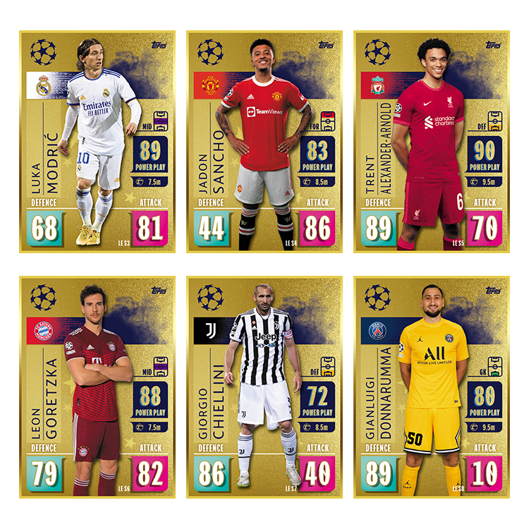 Le multi-pack contient 2 cartes-stickers SUPERSTAR en édition limitée aléatoires parmi 6 modèles LE S3. Luka Modric LE S4. Jadon Sancho LE S5. Trent Alexander-Arnold LE S6. Leon Goretzka LE S7. Giorgio Chiellini LE S8. Gianluigi Donnarumma