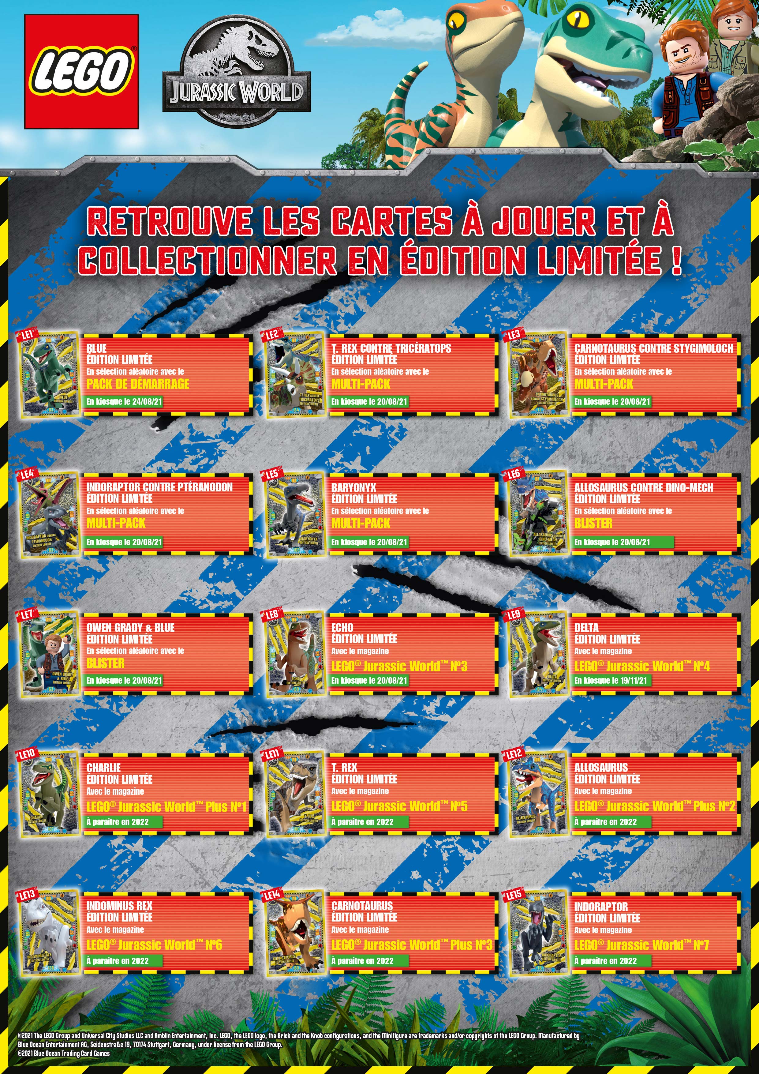 LES AUTRES CARTES "LIMITED EDITION" LE8. ECHO - Magazine LEGO JURASSIC WORLD N°3 (août 2021) LE9. DELTA - Magazine LEGO JURASSIC WORLD N°4 (novembre 2021) LE10. CHARLIE - Magazine LEGO JURASSIC WORLD PLUS N°1 (2022) LE11. T. REX - Magazine LEGO JURASSIC WORLD N°5 (2022) LE12. ALLOSAURUS - Magazine LEGO JURASSIC WORLD PLUS N°2 (2022) LE13. INDOMINUS REX - Magazine LEGO JURASSIC WORLD N°6 (2022) LE14. CARNOTAURUS - Magazine LEGO JURASSIC WORLD PLUS N°3 (2022) LE15. INDORAPTOR - Magazine LEGO JURASSIC WORLD N°7 (2022)