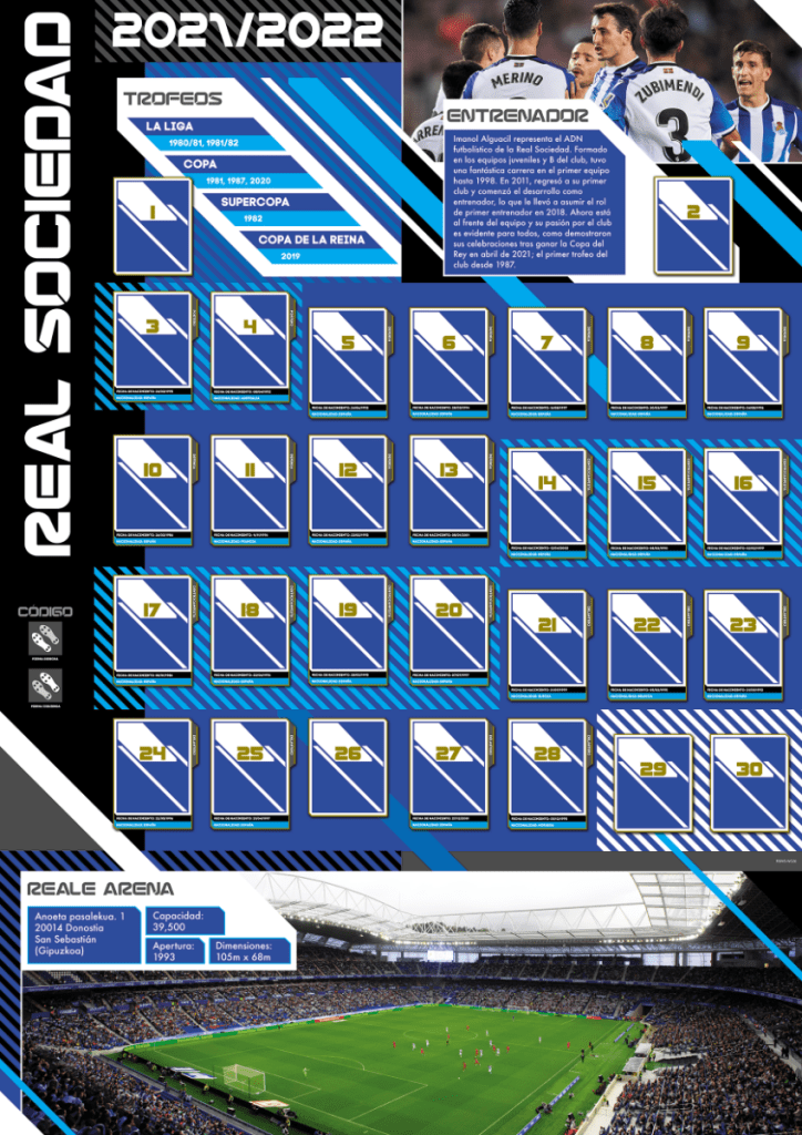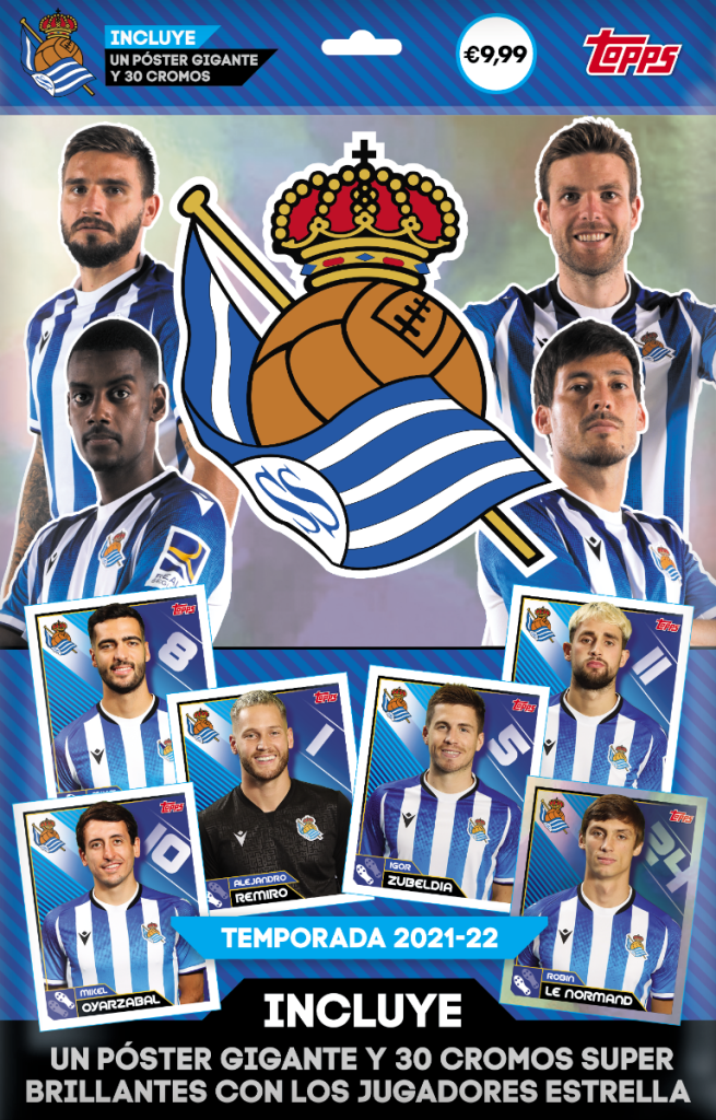 Après le FC Barcelone, Topps Espagne édite un nouveau pack de 30 stickers à coller sur un poster géant, cette fois-ci avec l’équipe de la Real Sociedad qui joue actuellement les premiers rôles en Liga.