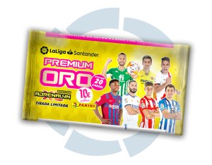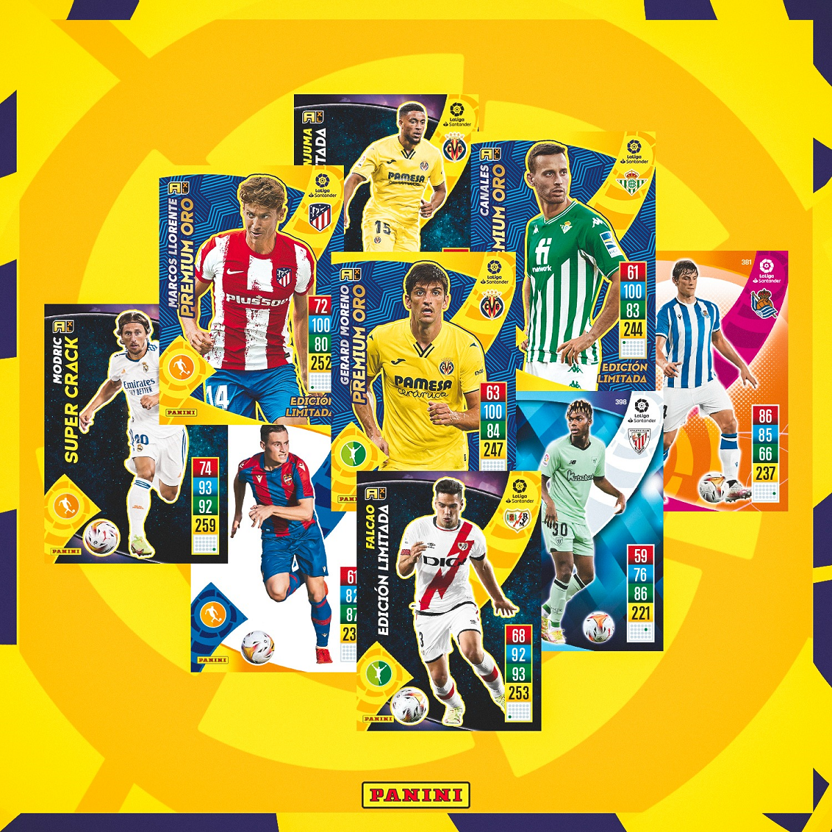 La pochette PREMIUM ORO contient 2 cartes en édition limitée + 3 cartes en édition limitée PREMIUM ORO LE. Danjuma (Villarreal C.F.) LE. Falcao (Rayo Vallecano) LEPO. Canales (Real Betis) LEPO. Marcos Llorente (Atlético de Madrid) LEPO. Gerard Moreno (Villarreal C.F.)