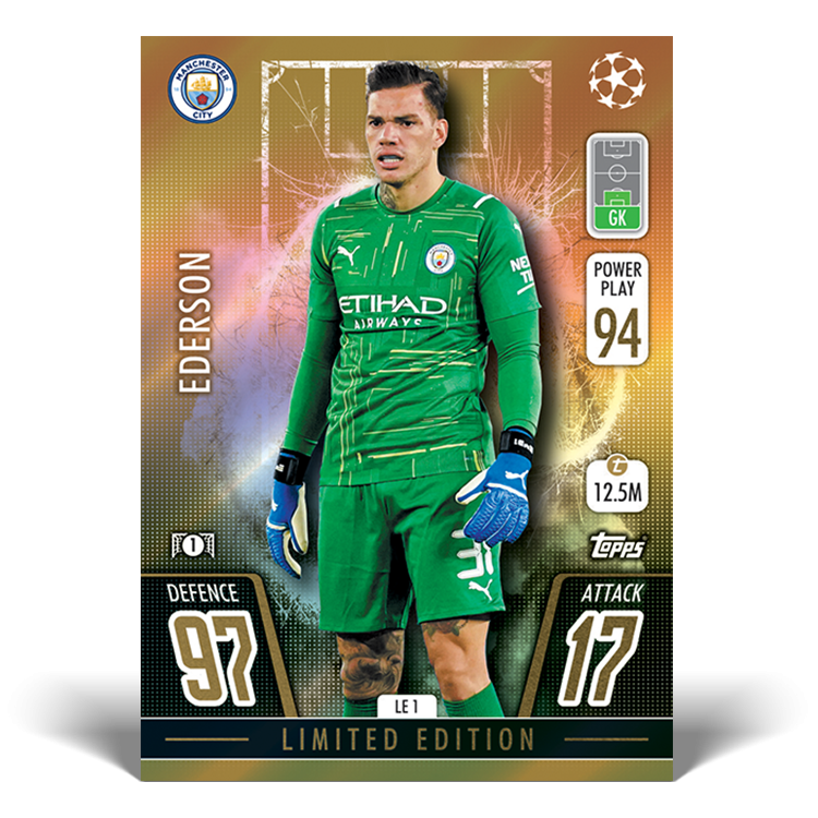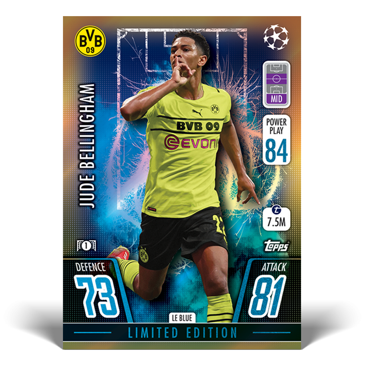 LES CARTES "LIMITED EDITION" LE 1. Ederson (Manchester City) LE 2. Luke Shaw (Manchester United) LE 3. Virgil van Dijk (Liverpool) LE 4. Timo Werner (Chelsea) LE 5. Youri Tielemans (Leicester City) LE 6. Michail Antonio (West Ham United) LE 7. Harry Kane (Tottenham Hotspur) LE 8. Rodrigo De Paul (Club Atlético de Madrid) LE 9. Toni Kroos (Real Madrid) LE10. Pedri (FC Barcelona) LE11. Nicolò Barella (FC Internazionale Milano) LE12. Theo Hernández (AC Milan) LE13. Paulo Dybala (Juventus) LE14. Sergej Milinković-Savić (SS Lazio) LE15. Jamal Musialla (FC Bayern München) LE16. Dani Olmo (RB Leipzig) LE17. Georginio Wijnaldum (Paris Saint-Germain)LE BLUE. Jude Bellingham (Borussia Dortmund)