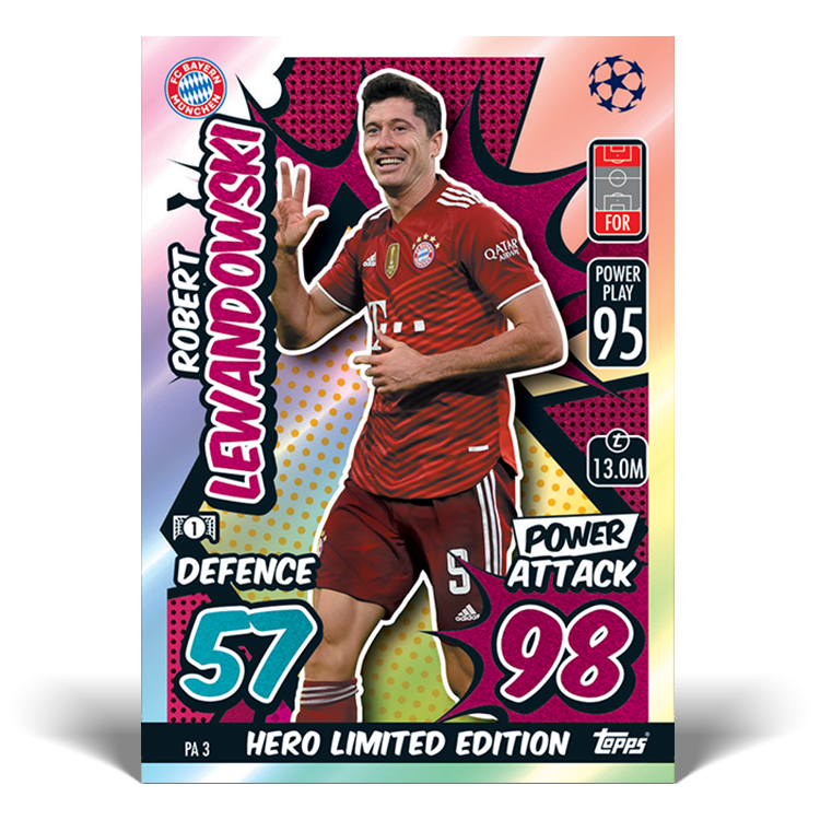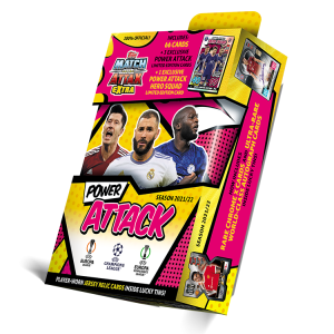 La grande boîte en métal POWER ATTACK contient 3 cartes en édition limitée exclusives PA 1. Romelu Lukaku (Chelsea)PA 2. Karim Benzema (Real Madrid CF) PA 3. Robert Lewandowski (FC Bayern München)