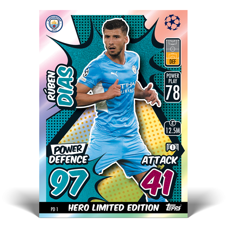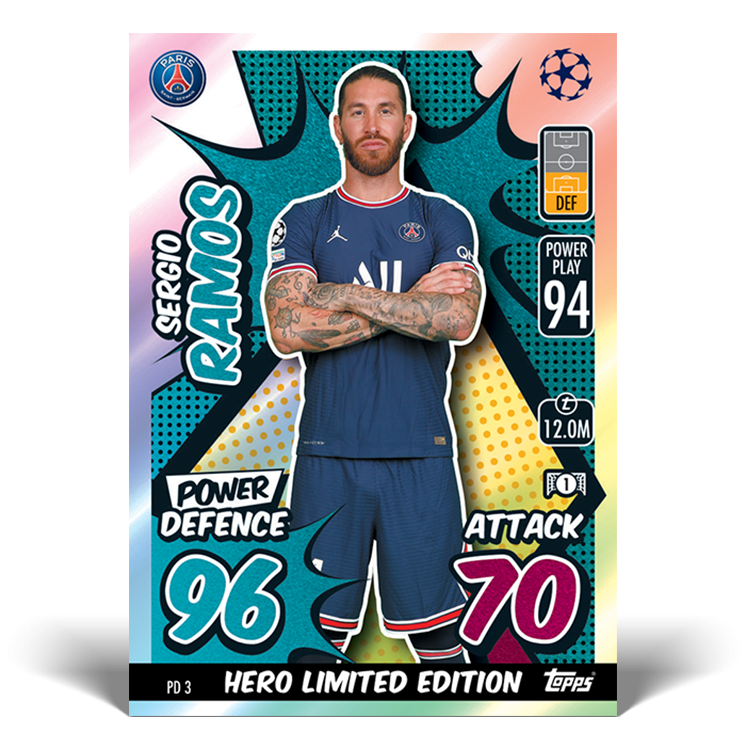 La grande boîte en métal POWER DEFENCE contient 3 cartes en édition limitée exclusives PD 1. Ruben Dias (Manchester City)PD 2. Dayot Upamecano (FC Bayern München) PD 3. Sergio Ramos (Paris Saint-Germain)