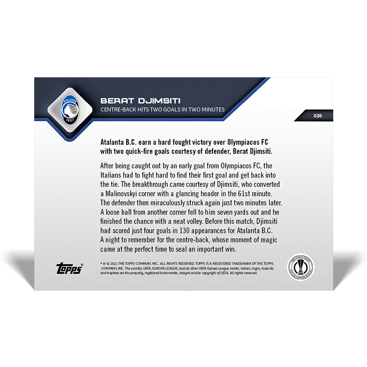 TOPPS NOW « UEFA EUROPA LEAGUE 2021/22 » : visuel des cartes 024 à 026 (seizièmes de finale aller du 17/02) Thierry K.23/02/202225/07/2022ACTUALITÉS, DÉCOUVERTE, EDITION LIMITÉE Navigation des articles PrécédentSuivant Partager : Imprimer(ouvre dans une nouvelle fenêtre) Imprimer Envoyer un lien par e-mail à un ami(ouvre dans une nouvelle fenêtre) E-mail Partager sur Facebook(ouvre dans une nouvelle fenêtre) Facebook Partager sur X(ouvre dans une nouvelle fenêtre) X J’aime chargement… Articles similaires