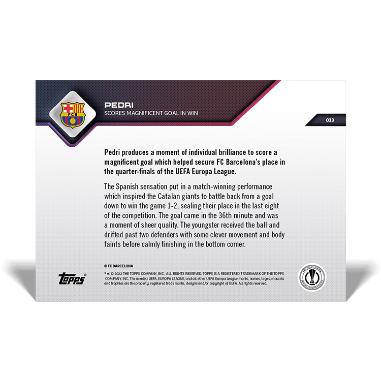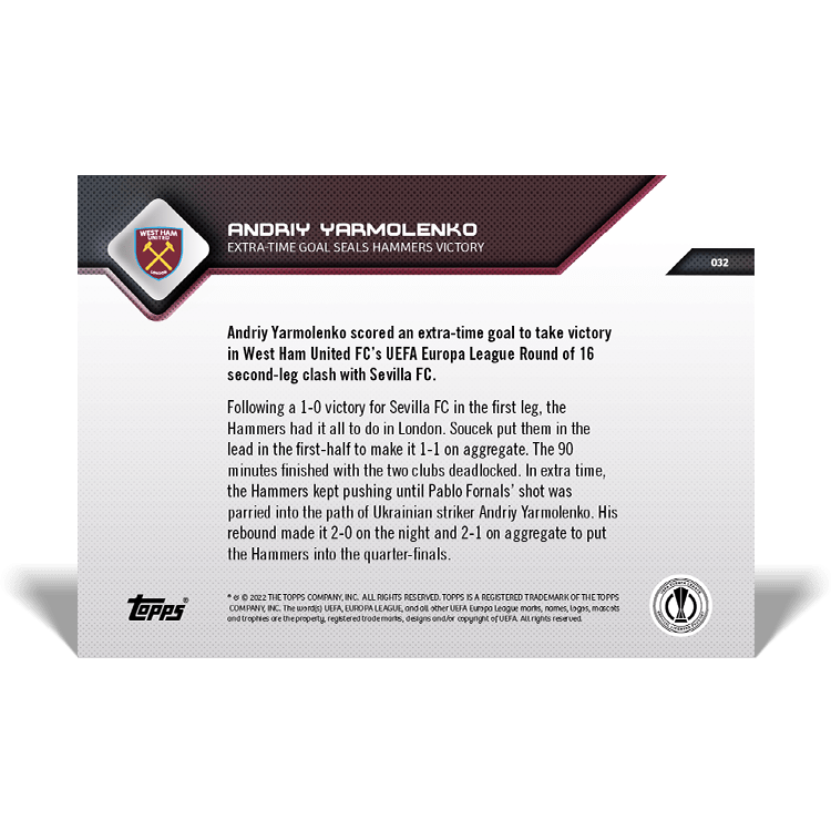 TOPPS NOW « UEFA EUROPA LEAGUE 2021/22 » : visuel des cartes 032 à 034 (huitièmes de finale retour du 17/03) Thierry K.22/03/202225/07/2022ACTUALITÉS, DÉCOUVERTE, EDITION LIMITÉE Navigation des articles PrécédentSuivant Partager : Cliquer pour imprimer(ouvre dans une nouvelle fenêtre) Imprimer Cliquer pour envoyer un lien par e-mail à un ami(ouvre dans une nouvelle fenêtre) E-mail Cliquez pour partager sur Facebook(ouvre dans une nouvelle fenêtre) Facebook Cliquer pour partager sur X(ouvre dans une nouvelle fenêtre) X J’aime chargement… Articles similaires