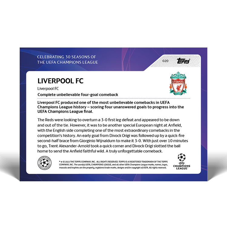 Topps célèbre les trente ans de l’UEFA Champions League avec les moments les plus emblématiques de l’histoire de la compétition.