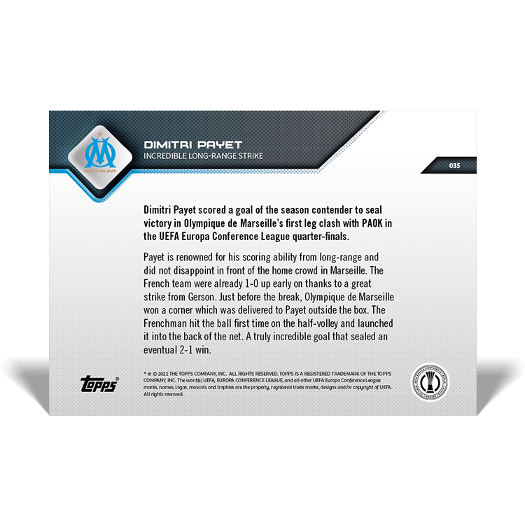 TOPPS NOW « UEFA EUROPA CONFERENCE LEAGUE 2021/22 » : visuel de la carte 035 (quart de finale aller du 07/04) Thierry K.11/04/202225/07/2022ACTUALITÉS, DÉCOUVERTE, EDITION LIMITÉE Navigation des articles PrécédentSuivant Marseille 2 – 1 PAOK Salonique Partager : Cliquer pour imprimer(ouvre dans une nouvelle fenêtre) Imprimer Cliquer pour envoyer un lien par e-mail à un ami(ouvre dans une nouvelle fenêtre) E-mail Cliquez pour partager sur Facebook(ouvre dans une nouvelle fenêtre) Facebook Cliquer pour partager sur X(ouvre dans une nouvelle fenêtre) X J’aime chargement… Articles similaires