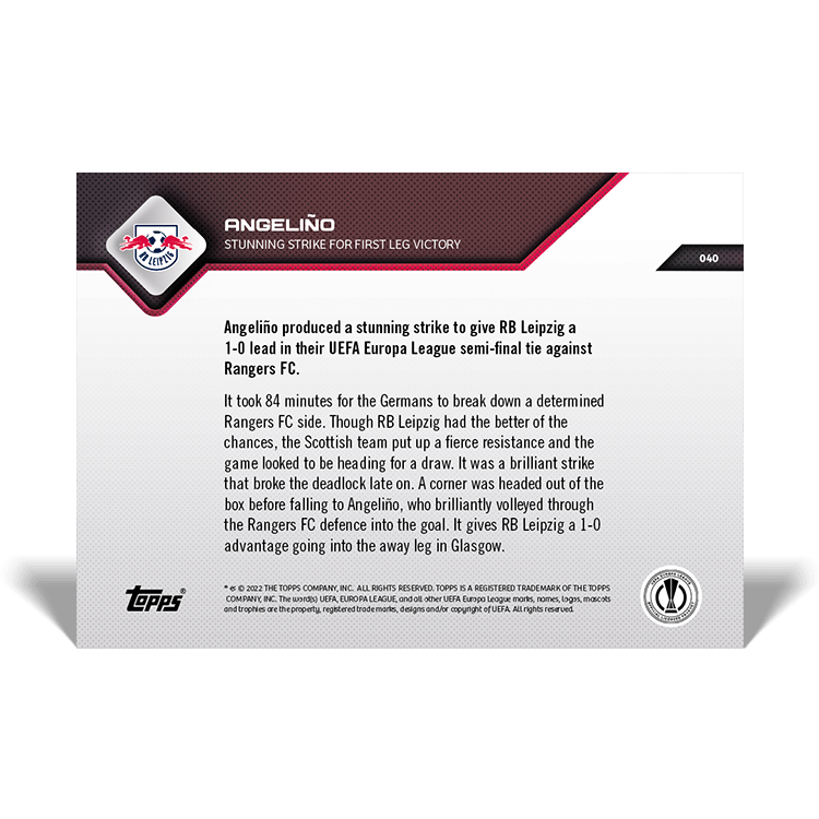 TOPPS NOW « UEFA EUROPA LEAGUE 2021/22 » : visuel de la carte 040 (demi-finale aller du 28/04) Thierry K.03/05/202225/07/2022ACTUALITÉS, DÉCOUVERTE, EDITION LIMITÉE Navigation des articles PrécédentSuivant RB Leipzig 1 – 0 Glasgow Rangers Partager : Cliquer pour imprimer(ouvre dans une nouvelle fenêtre) Imprimer Cliquer pour envoyer un lien par e-mail à un ami(ouvre dans une nouvelle fenêtre) E-mail Cliquez pour partager sur Facebook(ouvre dans une nouvelle fenêtre) Facebook Cliquer pour partager sur X(ouvre dans une nouvelle fenêtre) X J’aime chargement… Articles similaires