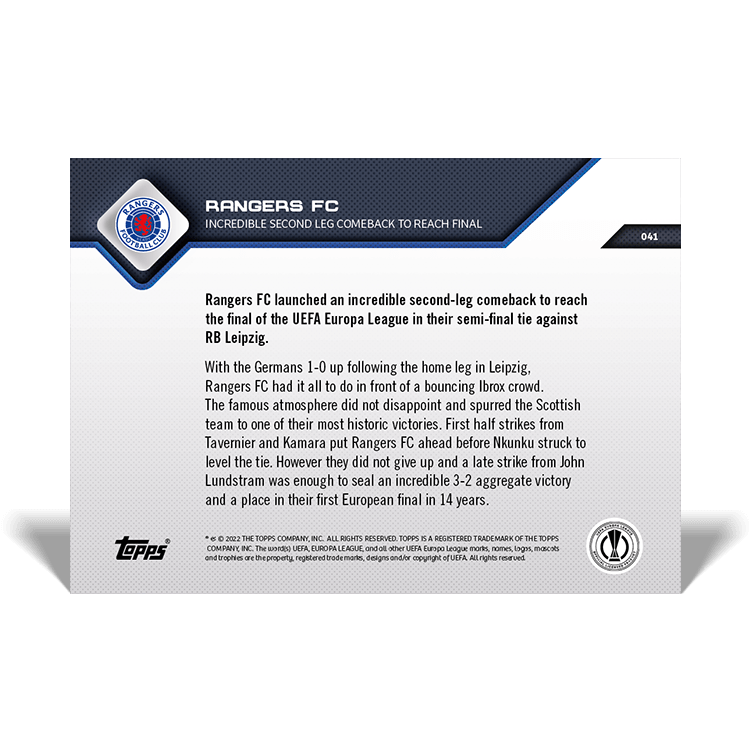 TOPPS NOW « UEFA EUROPA LEAGUE 2021/22 » : visuel des cartes 041 à 042 (demi-finale retour du 05/05) Thierry K.10/05/202225/07/2022ACTUALITÉS, DÉCOUVERTE, EDITION LIMITÉE Navigation des articles PrécédentSuivant Glasgow Rangers 3 – 1 RB Leipzig Partager : Cliquer pour imprimer(ouvre dans une nouvelle fenêtre) Imprimer Cliquer pour envoyer un lien par e-mail à un ami(ouvre dans une nouvelle fenêtre) E-mail Cliquez pour partager sur Facebook(ouvre dans une nouvelle fenêtre) Facebook Cliquer pour partager sur X(ouvre dans une nouvelle fenêtre) X J’aime chargement… Articles similaires
