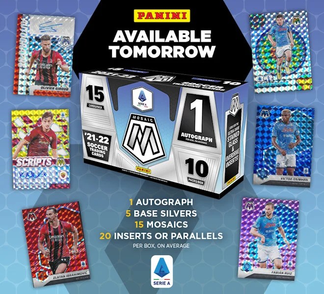 INSERT / OVERDRIVE 1. Olivier Giroud - AC Milan 2. Marco Van Basten - AC Milan 3. Jurgen Klinsmann - FC Internazionale Milano 4. David Trezeguet - Juventus 5. Weston McKennie - Juventus 6. Mike Maignan - AC Milan 7. Pierre Kalulu - AC Milan 8. Joakim Maehle - Atalanta BC 9. Andrea Pinamonti - Empoli FC 10. Lazar Samardzic - Udinese Calcio 11. Giacomo Raspadori - US Sassuolo Calcio 12. Matheus Henrique - US Sassuolo Calcio 13. Ante Rebic - AC Milan 14. Rafael Leao - AC Milan 15. Zlatan Ibrahimovic - AC Milan 16. Bartlomiej Dragowski - ACF Fiorentina 17. Giacomo Bonaventura - ACF Fiorentina 18. Nicolas Gonzalez - ACF Fiorentina 19. Nikola Milenkovic - ACF Fiorentina 20. Bryan Cristante - AS Roma 21. Henrikh Mkhitaryan - AS Roma 22. Nicolo Zaniolo - AS Roma 23. Roger Ibanez - AS Roma 24. Duvan Zapata - Atalanta BC 25. Luis Muriel - Atalanta BC 26. Matteo Pessina - Atalanta BC 27. Marko Arnautovic - Bologna FC 28. Nicolas Dominguez - Bologna FC 29. Riccardo Orsolini - Bologna FC 30. Jerdy Schouten - Bologna FC 31. Nahitan Nandez - Cagliari Calcio 32. Alessandro Bastoni - FC Internazionale Milano 33. Hakan Calhanoglu - FC Internazionale Milano 34. Samir Handanovic - FC Internazionale Milano 35. Nicolo Rovella - Genoa CFC 36. Antonin Barak - Hellas Verona FC 37. Juan Cuadrado - Juventus 38. Matthijs de Ligt - Juventus 39. Paulo Dybala - Juventus 40. Felipe Anderson - SS Lazio 41. Luis Alberto - SS Lazio 42. Giovanni Di Lorenzo - SSC Napoli 43. Lorenzo Insigne - SSC Napoli 44. Piotr Zielinski - SSC Napoli 45. Andrea Belotti - Torino FC 46. Fabio Quagliarella - UC Sampdoria 47. Maya Yoshida - UC Sampdoria 48. Gerard Deulofeu - Udinese Calcio 49. Gianluca Scamacca - US Sassuolo Calcio 50. Tanner Tessmann - Venezia FC INSERT / PITCH MASTERS 1. Fikayo Tomori - AC Milan 2. Zlatan Ibrahimovic - AC Milan 3. Giacomo Bonaventura - ACF Fiorentina 4. Gianluca Mancini - AS Roma 5. Lorenzo Pellegrini - AS Roma 6. Duvan Zapata - Atalanta BC 7. Matteo Pessina - Atalanta BC 8. Juan Musso - Atalanta BC 9. Kevin Bonifazi - Bologna FC 10. Joao Pedro - Cagliari Calcio 11. Szymon Zurkowski - Empoli FC 12. Denzel Dumfries - FC Internazionale Milano 13. Nicolo Barella - FC Internazionale Milano 14. Nicolo Rovella - Genoa CFC 15. Antonin Barak - Hellas Verona FC16 Paulo Dybala - Juventus 17. Danilo - Juventus 18. Federico Chiesa - Juventus 19. Kaio Jorge - Juventus 20. Ebrima Colley - Spezia Calcio 21. Manuel Lazzari - SS Lazio 22. Victor Osimhen - SSC Napoli 23. Karol Linetty - Torino FC 24. Francesco Caputo - UC Sampdoria 25. Fabio Quagliarella - UC Sampdoria 26. Bram Nuytinck - Udinese Calcio 27. Mamadou Coulibaly - US Salernitana 28. Maxime Lopez - US Sassuolo Calcio 29. Mert Muldur - US Sassuolo Calcio 30. Mattia Aramu - Venezia FC INSERT / STAINED GLASS 1. Kaka - AC Milan 2. Paolo Maldini - AC Milan 3. Gabriel Batistuta - ACF Fiorentina 4. Francesco Totti - AS Roma 5. Luis Figo - FC Internazionale Milano 6. Nedim Bajrami - Empoli FC 7. Zinho Vanheusden - Genoa CFC 8. Giulio Maggiore - Spezia Calcio 9. Nahuel Molina - Udinese Calcio 10. Franck Kessie - AC Milan 11. Sandro Tonali - AC Milan 12. Theo Hernandez - AC Milan 13. Cristiano Biraghi - ACF Fiorentina 14. Dusan Vlahovic - Juventus 15. Gaetano Castrovilli - ACF Fiorentina 16. Lorenzo Pellegrini - AS Roma 17. Tammy Abraham - AS Roma 18. Juan Musso - Atalanta BC 19. Remo Freuler - Atalanta BC 20. Marten de Roon - Atalanta BC 21. Ruslan Malinovskyi - Atalanta BC 22. Mattias Svanberg - Bologna FC 23. Musa Barrow - Bologna FC 24. Alessio Cragno - Cagliari Calcio 25. Edin Dzeko - FC Internazionale Milano 26. Lautaro Martinez - FC Internazionale Milano 27. Nicolo Barella - FC Internazionale Milano 28. Ivan Ilic - Hellas Verona FC 29. Lucas Torreira - ACF Fiorentina 30. Adrien Rabiot - Juventus 31. Wojciech Szczesny - Juventus 32. Federico Chiesa - Juventus 33. Manuel Locatelli - Juventus 34. Ciro Immobile - SS Lazio 35. Sergej Milinkovic-Savic - SS Lazio 36. Fabian Ruiz - SSC Napoli 37. Hirving Lozano - SSC Napoli 38. Kalidou Koulibaly - SSC Napoli 39. Victor Osimhen - SSC Napoli 40. Gleison Bremer - Torino FC 41. Rolando Mandragora - Torino FC 42. Emil Audero - UC Sampdoria 43. Mikkel Damsgaard - UC Sampdoria 44. Morten Thorsby - UC Sampdoria 45. Jens Stryger Larsen - Udinese Calcio 46. Domenico Berardi - US Sassuolo Calcio 47. Hamed Traore - US Sassuolo Calcio 48. Davide Frattesi - US Sassuolo Calcio 49. Maxime Lopez - US Sassuolo Calcio 50. Gianluca Busio - Venezia FC