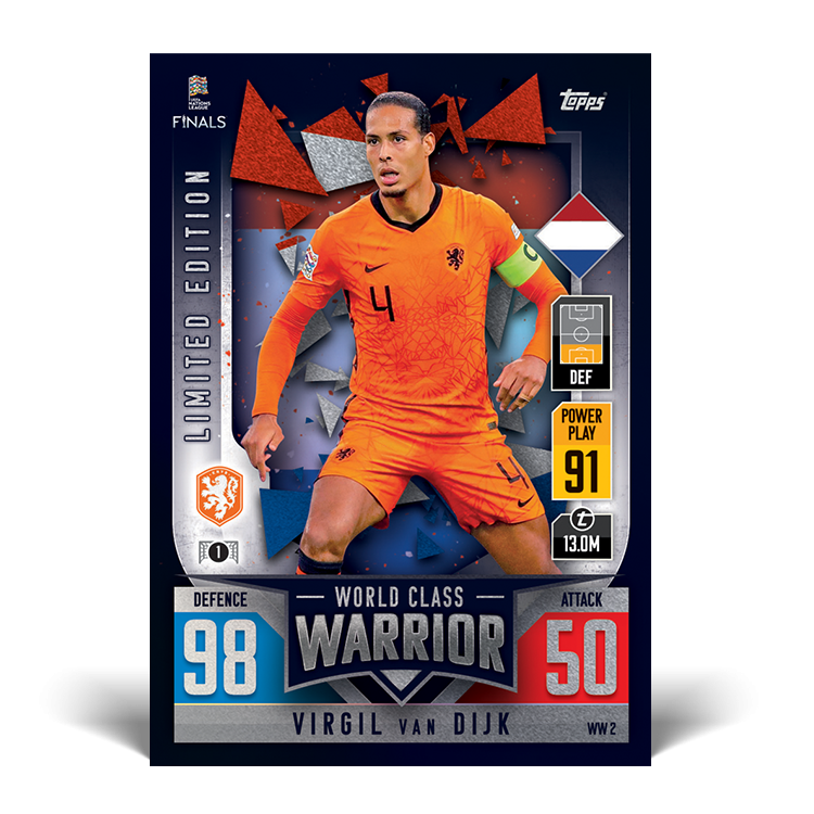 Chaque grande boîte en métal contient 1 carte en édition limitée WORLD CLASS WARRIOR exclusive LE WW1. Rúben Dias (Portugal) - Boîte BLUELE WW2. Virgil van Dijk (Netherlands) - Boîte SILVER