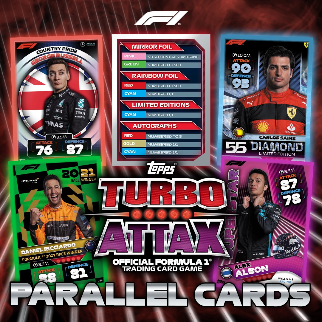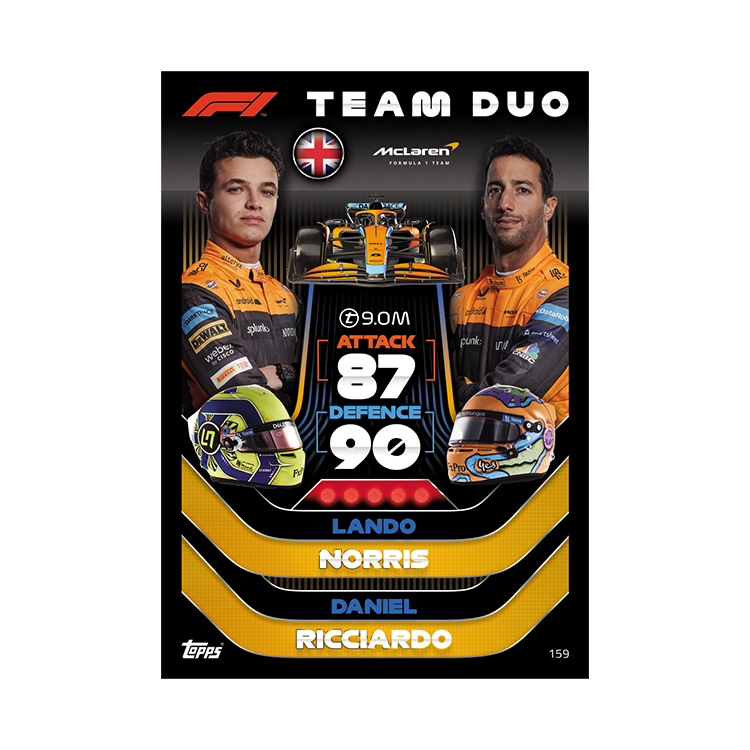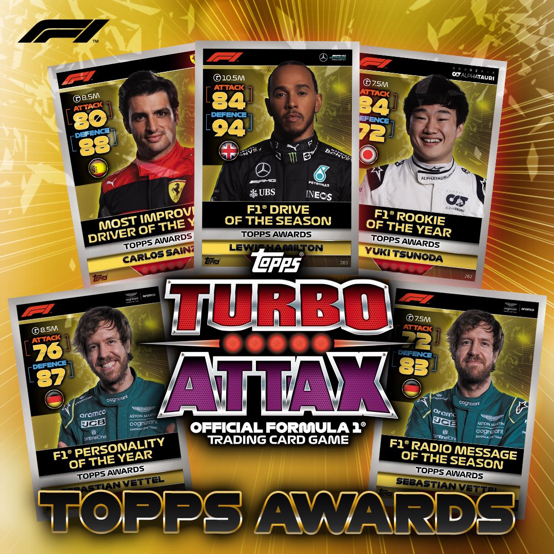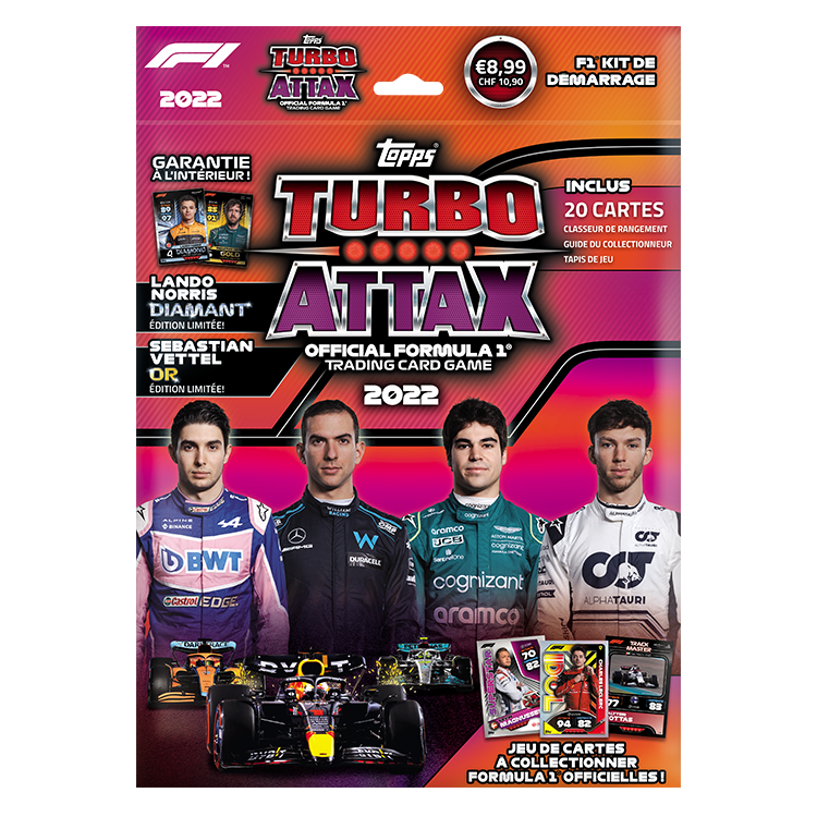 F1 STATS ATTAX 132. Max Verstappen (Red Bull Racing) 133. Lewis Hamilton (Mercedes-AMG) 134. Carlos Sainz (Ferrari) 135. Sebastian Vettel (Aston Martin) F1 SPEEDSTER 136. Max Verstappen (Red Bull Racing) 137. Sergio Perez (Red Bull Racing) 138. Lewis Hamilton (Mercedes-AMG) 139. George Russell (Mercedes-AMG) 140. Carlos Sainz (Ferrari) 141. Charles Leclerc (Ferrari) 142. Lando Norris (McLaren) 143. Daniel Ricciardo (McLaren) 144. Fernando Alonso (Alpine) 145. Esteban Ocon (Alpine) 146. Pierre Gasly (Scuderia AlphaTauri) 147. Yuki Tsunoda (Scuderia AlphaTauri) 148. Sebastian Vettel (Aston Martin) 149. Lance Stroll (Aston Martin) 150. Nicholas Latifi (Williams) 151. Alex Albon (Williams) 152. Valtteri Bottas (Alfa Romeo) 153. Zhou Guanyu (Alfa Romeo) 154. Mick Schumacher (Haas) 155. Kevin Magnussen (Haas)