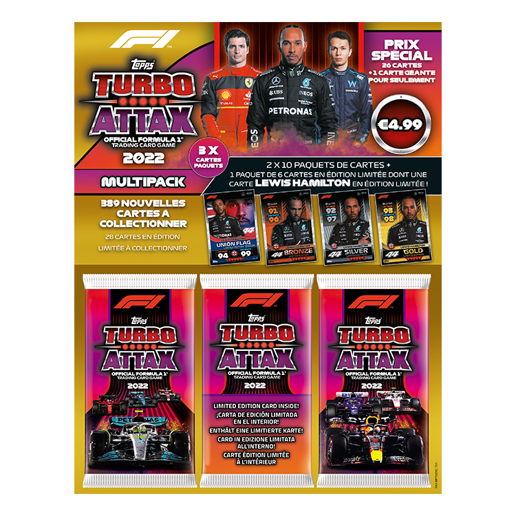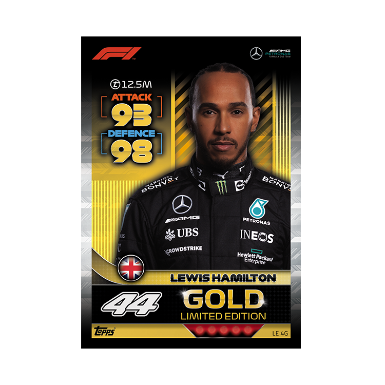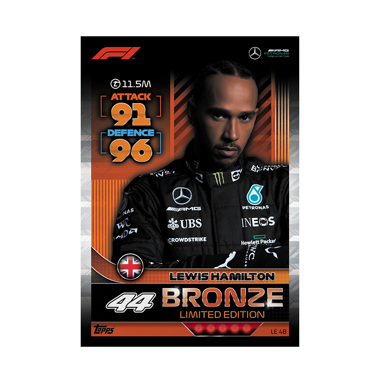 Chaque multipack LEWIS HAMILTON contient 1 carte en édition limitée BRONZE ou SILVER ou GOLD ou ULTRA RARE LE 4B. Lewis Hamilton (Mercedes-AMG)LE 4S. Lewis Hamilton (Mercedes-AMG)