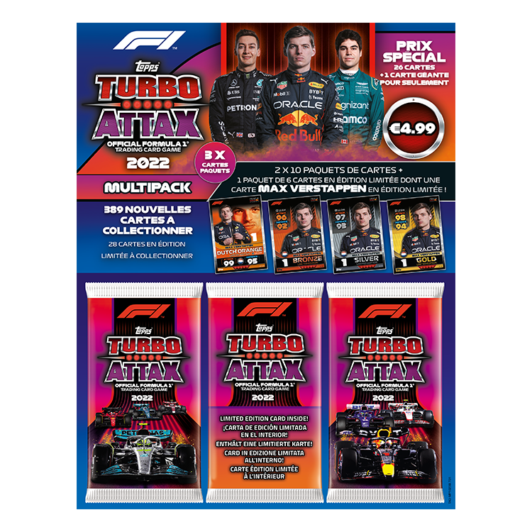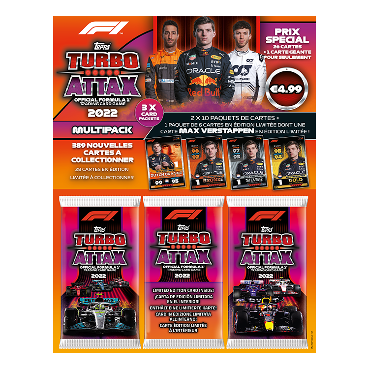 Chaque multipack MAX VERSTAPPEN contient 1 carte en édition limitée BRONZE ou SILVER ou GOLD ou ULTRA RARE LE 3B. Max Verstappen (Red Bull Racing)LE 3S. Max Verstappen (Red Bull Racing)