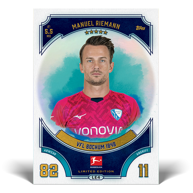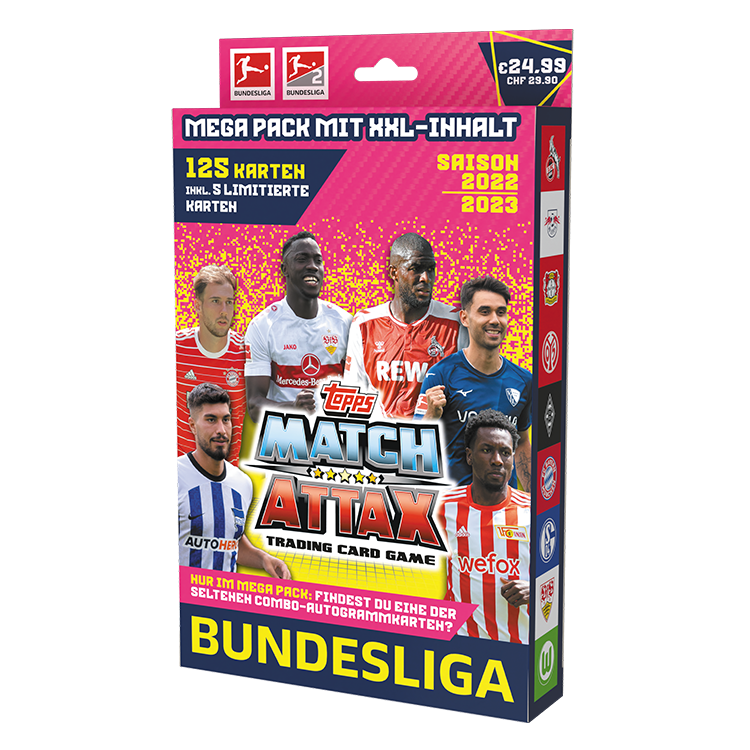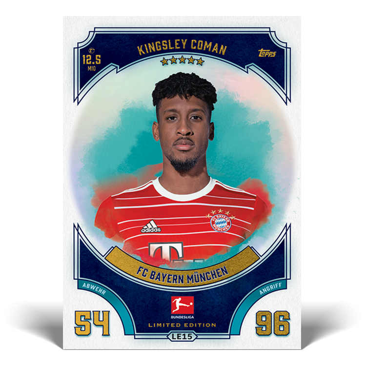 LES CARTES "LIMITED EDITION" LE1. Reece Oxford (FC Augsburg) LE2. Marco Richter (Hertha BSC) LE3. Jamie Leweling (1. FC Union Berlin) LE4. Manuel Riemann (VfL Bochum 1848) LE5. Anthony Jung (SV Werder Bremen) LE6. Niklas Süle (Borussia Dortmund) LE7. Mario Götze (Eintracht Frankfurt) LE8. Christian Günter (Sport-Club Freiburg) LE9. Diadie Samassékou (TSG Hoffenheim) LE10. Jan Thielmann (1. FC Köln) LE11. André Silva (RB Leipzig) LE12. Amine Adli (Bayer 04 Leverkusen) LE13. Anton Stach (1. FSV Mainz 05) LE14. Manu Koné (Borussia Mönchengladbach) LE15. Kingsley Coman (FC Bayern München) LE16. Marius Bülter (FC Schalke 04) LE17. Silas Katompa Mvumpa (VfB Stuttgart) LE18. Ridle Baku (VfL Wolfsburg) LE19. Meisterschale Bundesliga LE20. Meisterschale 2. Bundesliga LE21. Topps Logo LE22. Supercup LE23. Offizieller Spielball