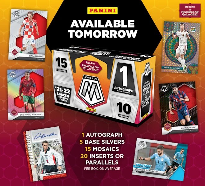AUTOGRAPH / SCRIPT MOSAIC 1. Chris Richards - United States 2. Ricardo Pepi - United States Rookie Card 3. Marco Van Basten - Netherlands 4. Neymar Jr - Brazil 5. Kevin De Bruyne - Belgium 6. Harry Kane - England 7. Kasper Schmeichel - Denmark 8. Mats Hummels - Germany 9. Serge Gnabry - Germany 10. Cesc Fabregas - Spain 11. David Trezeguet - France 12. Kyle Walker - England 13. Ruben Dias - Portugal 14. Timothy Weah - United States 15. Eden Hazard - Belgium 16. Pedri - Spain 17. Christian Pulisic - United States 18. Thiago Silva - Brazil 19. Federico Valverde - Uruguay 20. Josh Sargent - United States 21. Sepp Maier - Germany 22. Raphael Varane - France 23. Lucas Martinez Quarta - Argentina Rookie Card 24. Thiago Alcantara - Spain 25. Renato Tapia - Peru 26. Andres Guardado - Mexico 27. Dani Alves - Brazil 28. Robin Gosens - Germany 29. Ivan Perisic - Croatia 31. Jack Grealish - England 32. Filippo Inzaghi - Italy 33. Luis Figo - Portugal 34. Javier Mascherano - Argentina 35. Nicolo Zaniolo - Italy 36. Ruud van Nistelrooy - Netherlands 37. Jens Lehmann - Germany 38. Francesco Totti - Italy 39. Marc Janko - Austria 40. Cobi Jones - United States 41. Gabriel Batistuta - Argentina 42. Carlos Valderrama - Colombia 43. Yeremy Pino - Spain Rookie Card 44. Pau Torres - Spain 45. Roberto Baggio - Italy 46. Wayne Rooney - England 47. Jorge Campos - Mexico 48. Raul - Spain 49. Pele - Brazil 50. Clint Dempsey - United States INSERT / BREAKAWAY 1. Jude Bellingham - England 2. Daryl Dike - United States 3. Tom Rogic - Australia 4. Robert Lewandowski - Poland 5. Everton - Brazil 6. Timo Werner - Germany 7. Josip Brekalo - Croatia 8. Memphis Depay - Netherlands 9. Gonzalo Plata - Ecuador Rookie Card 10. Lionel Messi - Argentina 11. Haris Seferovic - Switzerland 12. Ansu Fati - Spain 13. Antoine Griezmann - France 14. Almoez Ali - Qatar Rookie Card 15. Alexander Isak - Sweden 16. Romelu Lukaku - Belgium 17. Ciro Immobile - Italy 18. Kasper Dolberg - Denmark 19. Lucas Hernandez - France 20. Nahitan Nandez - Uruguay 21. Darwin Machis - Venezuela 22. Sebastian Cordova - Mexico 23. Ridle Baku - Germany 24. Santiago Ormeno - Peru 25. Neco Williams - Wales 26. Duvan Zapata - Colombia 27. Marko Arnautovic - Austria 28. Cristiano Ronaldo - Portugal 29. Erling Haaland - Norway 30. Eduardo Vargas - Chile INSERT / GIVE AND GO 1. Edson Alvarez - Mexico 2. Denis Zakaria - Switzerland 3. Kingsley Coman - France 4. Arturo Vidal - Chile 5. Carlos Gruezo - Ecuador 6. Lautaro Martinez - Argentina 7. Luis Muriel - Colombia 8. Matthias Ginter - Germany 9. Gianluca Busio - United States 10. Pedri - Spain 11. Declan Rice - England 12. Tomas Rincon - Venezuela 13. Abdulaziz Hatem - Qatar Rookie Card 14. Frenkie de Jong - Netherlands 15. Marcelo Brozovic - Croatia 16. Domenico Berardi - Italy 17. Joao Felix - Portugal 18. Mohamed Elyounoussi - Norway 19. Daniel James - Wales 20. Piotr Zielinski - Poland 21. Lucas Paqueta - Brazil 22. Marcus Thuram - France 23. Yussuf Poulsen - Denmark 24. Florian Grillitsch - Austria 25. Dejan Kulusevski - Sweden 26. Luis Suarez - Uruguay 27. Jackson Irvine - Australia Rookie Card 28. Kevin De Bruyne - Belgium 29. Thilo Kehrer - Germany 30. Christian Cueva - Peru INSERT / INTERNATIONAL MEN OF MASTERY 1. Gianluigi Donnarumma - Italy 2. Florian Neuhaus - Germany 3. Weston McKennie - United States 4. Nicolas Gonzalez - Argentina 5. Alexis Sanchez - Chile 6. Emil Forsberg - Sweden 7. Karim Boudiaf - Qatar Rookie Card 8. Hirving Lozano - Mexico 9. Ruben Vargas - Switzerland 10. Matthijs de Ligt - Netherlands 11. Gianluca Lapadula - Peru 12. Rodri - Spain 13. Mateo Kovacic - Croatia 14. Alexander Sorloth - Norway Rookie Card 15. Thorgan Hazard - Belgium 16. Danilo - Brazil 17. Ilkay Gundogan - Germany 18. Yangel Herrera - Venezuela 19. N'Golo Kante - France 20. Danilo Pereira - Portugal 21. Harry Wilson - Wales 22. Stefan Lainer - Austria 23. Bartosz Bereszynski - Poland 24. Luis Diaz - Colombia 25. Angelo Preciado - Ecuador Rookie Card 26. Unai Simon - Spain 27. Leandro Paredes - Argentina 28. Manuel Locatelli - Italy 29. Yoshimar Yotun - Peru 30. Ousmane Dembele - France 31. Akram Hassan Afif - Qatar Rookie Card 32. Yerry Mina - Colombia 33. Thomas Meunier - Belgium 34. Matteo Pessina - Italy 35. Fabian Ruiz - Spain 36. Luis Suarez - Uruguay 37. Robin Gosens - Germany 38. Trent Sainsbury - Australia 39. Marcus Rashford - England 40. Marcelo Brozovic - Croatia INSERT / MONTAGE 1. Alvaro Morata - Spain 2. Hasan Al-Haydos - Qatar Rookie Card 3. Pedro Gallese - Peru 4. Renato Sanches - Portugal 5. Kieffer Moore - Wales 6. Nico Elvedi - Switzerland 7. Harry Souttar - Australia Rookie Card 8. Jorginho - Italy 9. Victor Nilsson Lindelof - Sweden 10. Lionel Messi - Argentina 11. Enner Valencia - Ecuador 12. Mateusz Klich - Poland 13. Roberto Firmino - Brazil 14. Stefan de Vrij - Netherlands 15. Adrien Rabiot - France 16. Martin Odegaard - Norway 17. Leroy Sane - Germany 18. Rodrigo Bentancur - Uruguay 19. Zack Steffen - United States 20. Jordan Pickford - England 21. Jeremy Doku - Belgium 22. Wuilker Farinez - Venezuela Rookie Card 23. Mario Pasalic - Croatia 24. Nicolo Barella - Italy 25. Simon Kjaer - Denmark 26. Claudio Bravo - Chile 27. Karim Adeyemi - Germany Rookie Card 28. Juan Cuadrado - Colombia 29. Carlos Salcedo - Mexico 30. Xaver Schlager - Austria