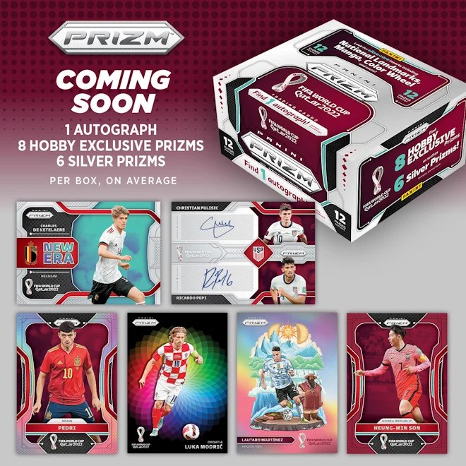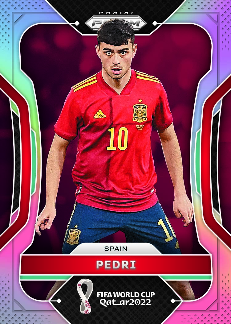 INSERT / PHENOMENON 1. Steven Bergwijn - Netherlands 2. Piero Hincapie - Ecuador 3. Angel Correa - Argentina 4. Bruno Fernandes - Portugal 5. Mateo Kovacic - Croatia 6. Christopher Nkunku - France 7. Raphinha - Brazil 8. Ismaila Sarr - Senegal 9. Bukayo Saka - England 10. Florian Wirtz - Germany 11. Alphonso Davies - Canada 12. Felix Afena-Gyan - Ghana 13. Andres Guardado - Mexico 14. Vinicius Jr. - Brazil 15. Lautaro Martinez - Argentina 16. Donyell Malen - Netherlands 17. Kevin De Bruyne - Belgium 18. Hee-chan Hwang - Korea Republic 19. Dusan Vlahovic - Serbia 20. Jude Bellingham - England 21. Christian Eriksen - Denmark 22. Bernardo Silva - Portugal 23. Thomas Muller - Germany 24. Achraf Hakimi - Morocco 25. Pedri - Spain 26. Jeremy Doku - Belgium 27. Christian Pulisic - United States 28. Antony - Brazil 29. Darwin Nunez - Uruguay 30. Julian Alvarez - Argentina 31. Maya Yoshida - Japan 32. Phil Foden - England 33. Brenden Aaronson - United States 34. Moussa Diaby - France INSERT / SCORERS CLUB 1. Neymar Jr - Brazil 2. Eden Hazard - Belgium 3. Genki Haraguchi - Japan 4. Kasper Dolberg - Denmark 5. Rogelio Funes Mori - Mexico 6. Olivier Giroud - France 7. Cristiano Ronaldo - Portugal 8. Raheem Sterling - England 9. Robert Lewandowski - Poland 10. Lionel Messi - Argentina 11. Timo Werner - Germany 12. Heung-Min Son - Korea Republic 13. Jonathan David - Canada 14. Sadio Mané - Senegal 15. Richarlison - Brazil 16. Michael Estrada - Ecuador 17. Donyell Malen - Netherlands 18. Kingsley Coman - France 19. Luis Suarez - Uruguay 20. Harry Kane - England 21. Lautaro Martinez - Argentina 22. Christian Pulisic - United States 23. Vincent Aboubakar - Cameroon 24. Andrej Kramaric - Croatia 25. Romelu Lukaku - Belgium 26. Dusan Vlahovic - Serbia 27. Marco Reus - Germany 28. Gabriel Jesus - Brazil 29. Edinson Cavani - Uruguay 30. Youssef En-Nesyri - Morocco INSERT / TEAM BADGES 1. Argentina 2. Belgium 3. Brazil 4. Cameroon 5. Canada 6. Croatia 7. Denmark 8. Ecuador 9. England 10. France 11. Germany 12. Ghana 13. Iran 14. Japan 15. Korea Republic 16. Mexico17 Morocco 18. Netherlands 19. Poland 20. Portugal 21. Qatar 22. Saudi Arabia 23. Senegal 24. Serbia 25. Spain 26. Switzerland 27. Tunisia 28. United States 29. Uruguay 30. Australia 31. Costa Rica 32. Wales source cardboardconnection.com