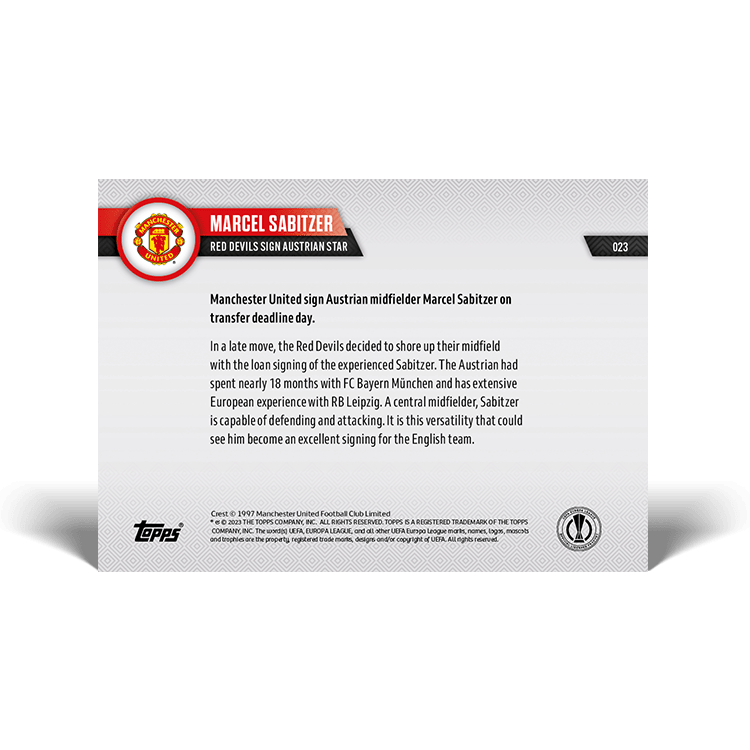 TOPPS NOW « UEFA EUROPA LEAGUES 2022/23 » : visuel des cartes 023 à 024 (mercato hivernal) Thierry K.03/02/202303/02/2023ACTUALITÉS, DÉCOUVERTE, EDITION LIMITÉE Navigation des articles PrécédentSuivant Partager : Cliquer pour imprimer(ouvre dans une nouvelle fenêtre) Imprimer Cliquer pour envoyer un lien par e-mail à un ami(ouvre dans une nouvelle fenêtre) E-mail Cliquez pour partager sur Facebook(ouvre dans une nouvelle fenêtre) Facebook Cliquer pour partager sur X(ouvre dans une nouvelle fenêtre) X J’aime chargement… Articles similaires