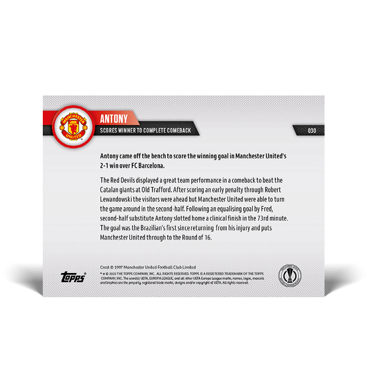 TOPPS NOW « UEFA EUROPA LEAGUES 2022/23 » : visuel des cartes 030 à 032 (seizièmes de finale retour du 23/02) Thierry K.02/03/202302/03/2023ACTUALITÉS, DÉCOUVERTE, EDITION LIMITÉE Navigation des articles PrécédentSuivant Partager : Cliquer pour imprimer(ouvre dans une nouvelle fenêtre) Imprimer Cliquer pour envoyer un lien par e-mail à un ami(ouvre dans une nouvelle fenêtre) E-mail Cliquez pour partager sur Facebook(ouvre dans une nouvelle fenêtre) Facebook Cliquer pour partager sur X(ouvre dans une nouvelle fenêtre) X J’aime chargement… Articles similaires