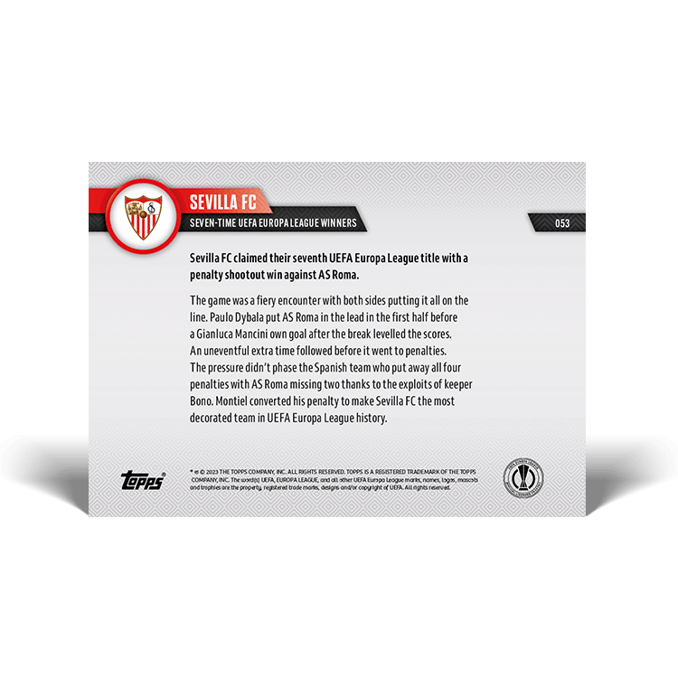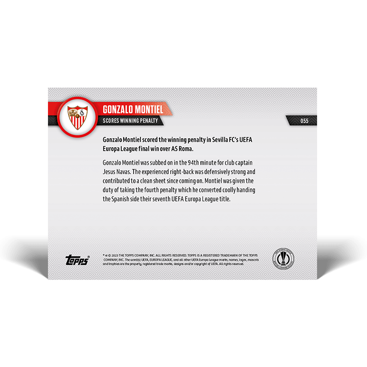 TOPPS NOW « UEFA EUROPA LEAGUE 2022/23 » : visuel des cartes 053 à 055 (finale du 31/05) Thierry K.02/06/202308/06/2023ACTUALITÉS, DÉCOUVERTE, EDITION LIMITÉE Navigation des articles PrécédentSuivant Séville FC 1 – 1 AS Rome (t.a.b. 4 – 1) Partager : Cliquer pour imprimer(ouvre dans une nouvelle fenêtre) Imprimer Cliquer pour envoyer un lien par e-mail à un ami(ouvre dans une nouvelle fenêtre) E-mail Cliquez pour partager sur Facebook(ouvre dans une nouvelle fenêtre) Facebook Cliquer pour partager sur X(ouvre dans une nouvelle fenêtre) X J’aime chargement… Articles similaires