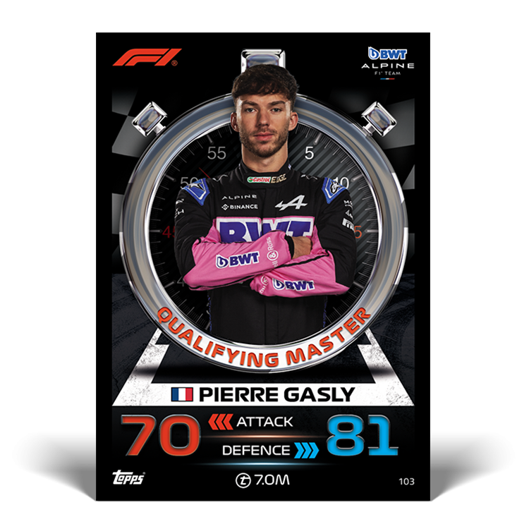 MC LAREN 46. McLaren Team Logo 47. 2023 F1 Car 48. Andrea Stella 49. McLaren Pit Crew 50. Lando Norris 51. Lando Norris 52. Oscar Piastri 53. Oscar Piastri 54. Lando Norris & Oscar Piastri ALFA ROMEO 55. Alfa Romeo Team Logo 56. 2023 F1 Car 57. Alessandro Alunni Bravi 58. Alfa Romeo Pit Crew 59. Valtteri Bottas 60. Valtteri Bottas 61. Zhou Guanyu 62. Zhou Guanyu 63. Valtteri Bottas & Zhou Guanyu ASTON MARTIN 64. Aston Martin Team Logo 65. 2023 F1 Car 66. Mike Krack 67. Aston Martin Pit Crew 68. Fernando Alonso 69. Fernando Alonso 70. Lance Stroll 71. Lance Stroll 72. Fernando Alonso & Lance Stroll HAAS 73. Haas Team Logo 74. 2023 F1 Car 75. Guenther Steiner 76. Haas Pit Crew 77. Kevin Magnussen 78. Kevin Magnussen 79. Nico Hülkenberg 80. Nico Hülkenberg 81. Kevin Magnussen & Nico Hülkenberg SCUDERIA ALPHA TAURI 82. Scuderia AlphaTauri Team Logo 83. 2023 F1 Car 84. Franz Tost 85. Scuderia AlphaTauri Pit Crew 86. Yuki Tsunoda 87. Yuki Tsunoda 88. Nyck de Vries 89. Nyck de Vries 90. Yuki Tsunoda & Nyck de Vries WILLIAMS 91. Williams Team Logo 92. 2023 F1 Car 93. James Vowles 94. Williams Pit Crew 95. Alex Albon 96. Alex Albon 97. Logan Sargeant 98. Logan Sargeant 99. Alex Albon & Logan Sargeant QUALIFYING MASTERS 100. Max Verstappen (Red Bull Racing) 101. Charles Leclerc (Ferrari) 102. Lewis Hamilton (Mercedes-AMG) 103. Pierre Gasly (Alpine) 104. Lando Norris (McLaren) 105. Valtteri Bottas (Alfa Romeo) 106. Fernando Alonso (Aston Martin) 107. Kevin Magnussen (Haas) 108. Alex Albon (Williams)