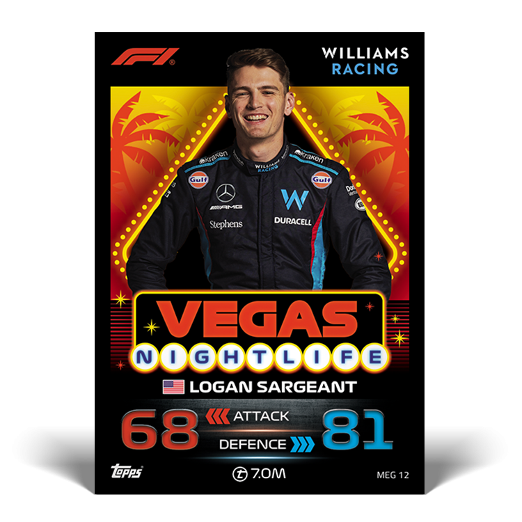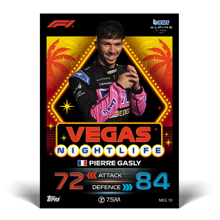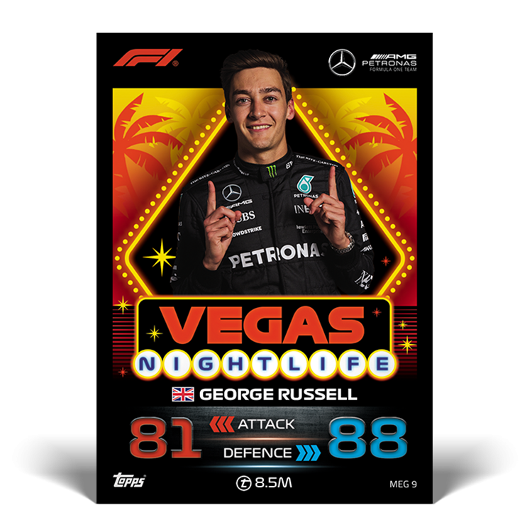 La grande boîte en métal "GREEN" contient 4 cartes VEGAS NIGHTLIFE exclusives MEG 9. George Russell (Mercedes-AMG)MEG 10. Pierre Gasly (Alpine)