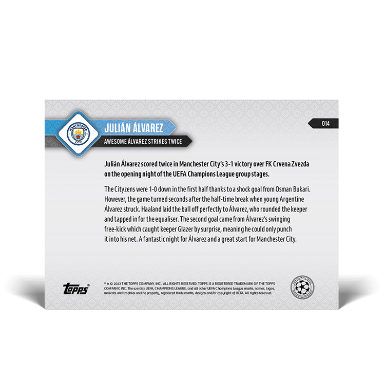 TOPPS NOW « UEFA CHAMPIONS LEAGUE 2023/24 » : visuel des cartes 006 à 015 (matchs de groupe du 19/09) Thierry K.28/09/202314/10/2023ACTUALITÉS, DÉCOUVERTE, EDITION LIMITÉE Navigation des articles PrécédentSuivant Partager : Cliquer pour imprimer(ouvre dans une nouvelle fenêtre) Imprimer Cliquer pour envoyer un lien par e-mail à un ami(ouvre dans une nouvelle fenêtre) E-mail Cliquez pour partager sur Facebook(ouvre dans une nouvelle fenêtre) Facebook Cliquer pour partager sur X(ouvre dans une nouvelle fenêtre) X J’aime chargement… Articles similaires
