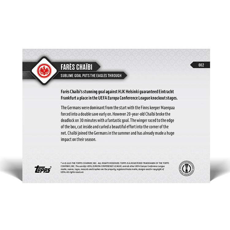 TOPPS NOW « UEFA EUROPA CONFERENCE LEAGUE 2023/24 » : visuel de la carte 002 (match de groupe du 09/11) Thierry K.16/11/202318/11/2023ACTUALITÉS, DÉCOUVERTE, EDITION LIMITÉE Navigation des articles PrécédentSuivant Partager : Cliquer pour imprimer(ouvre dans une nouvelle fenêtre) Imprimer Cliquer pour envoyer un lien par e-mail à un ami(ouvre dans une nouvelle fenêtre) E-mail Cliquez pour partager sur Facebook(ouvre dans une nouvelle fenêtre) Facebook Cliquer pour partager sur X(ouvre dans une nouvelle fenêtre) X J’aime chargement… Articles similaires