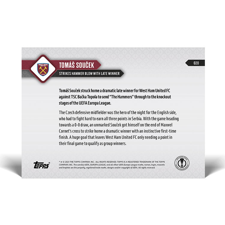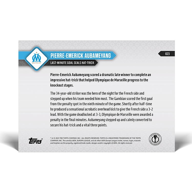 TOPPS NOW « UEFA EUROPA LEAGUE 2023/24 » : visuel des cartes 020 à 023 (matchs de groupe du 30/11) Thierry K.09/12/202309/12/2023ACTUALITÉS, DÉCOUVERTE, EDITION LIMITÉE Navigation des articles PrécédentSuivant Partager : Cliquer pour imprimer(ouvre dans une nouvelle fenêtre) Imprimer Cliquer pour envoyer un lien par e-mail à un ami(ouvre dans une nouvelle fenêtre) E-mail Cliquez pour partager sur Facebook(ouvre dans une nouvelle fenêtre) Facebook Cliquer pour partager sur X(ouvre dans une nouvelle fenêtre) X J’aime chargement… Articles similaires
