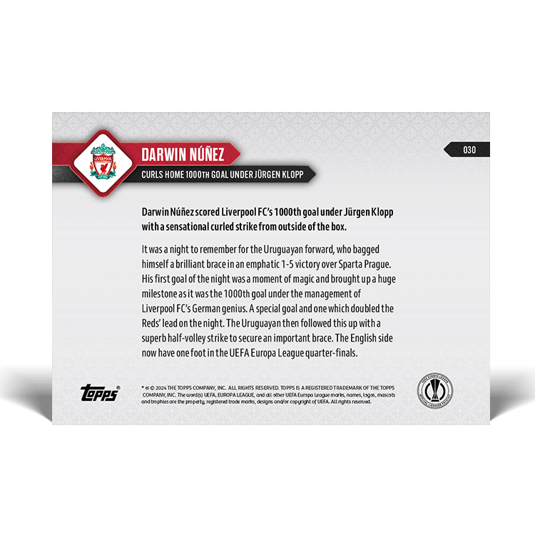 TOPPS NOW « UEFA EUROPA LEAGUE 2023/24 » : visuel des cartes 030 et 031 (huitièmes de finale aller du 07/03) Thierry K.12/03/202412/03/2024ACTUALITÉS, DÉCOUVERTE, EDITION LIMITÉE Navigation des articles PrécédentSuivant Partager : Cliquer pour imprimer(ouvre dans une nouvelle fenêtre) Imprimer Cliquer pour envoyer un lien par e-mail à un ami(ouvre dans une nouvelle fenêtre) E-mail Cliquez pour partager sur Facebook(ouvre dans une nouvelle fenêtre) Facebook Cliquer pour partager sur X(ouvre dans une nouvelle fenêtre) X J’aime chargement… Articles similaires
