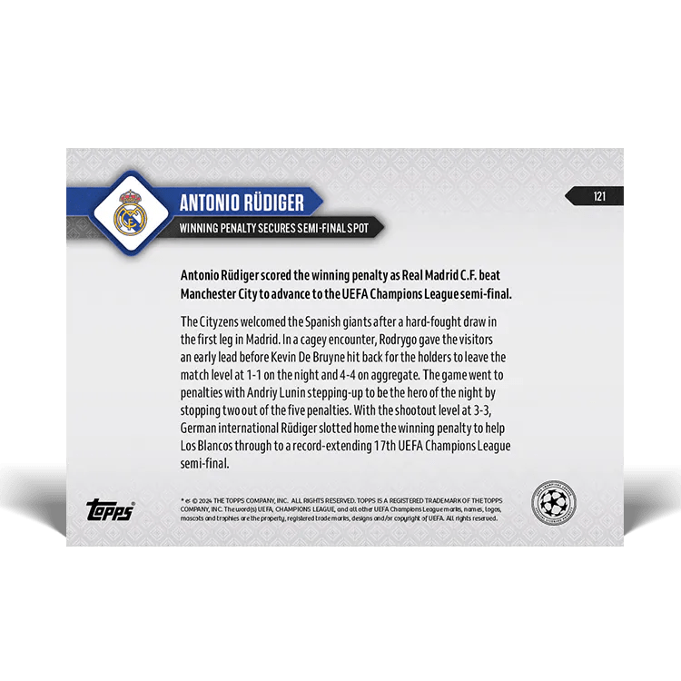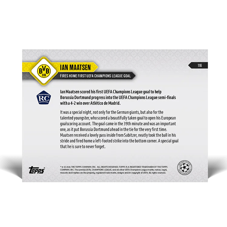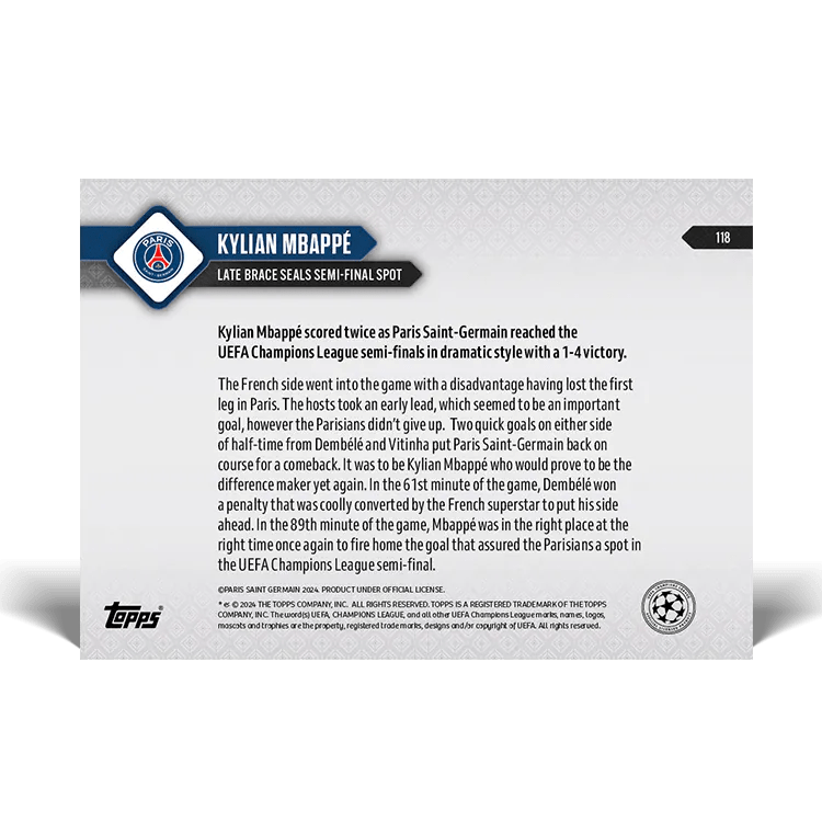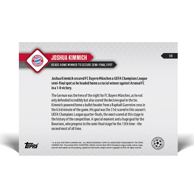 TOPPS NOW « UEFA CHAMPIONS LEAGUE 2023/24 » : visuel des cartes 116 à 121 (quarts de finale retour des 16 et 17/04) Thierry K.25/04/202414/05/2024ACTUALITÉS, DÉCOUVERTE, EDITION LIMITÉE Navigation des articles PrécédentSuivant Partager : Cliquer pour imprimer(ouvre dans une nouvelle fenêtre) Imprimer Cliquer pour envoyer un lien par e-mail à un ami(ouvre dans une nouvelle fenêtre) E-mail Cliquez pour partager sur Facebook(ouvre dans une nouvelle fenêtre) Facebook Cliquer pour partager sur X(ouvre dans une nouvelle fenêtre) X J’aime chargement… Articles similaires