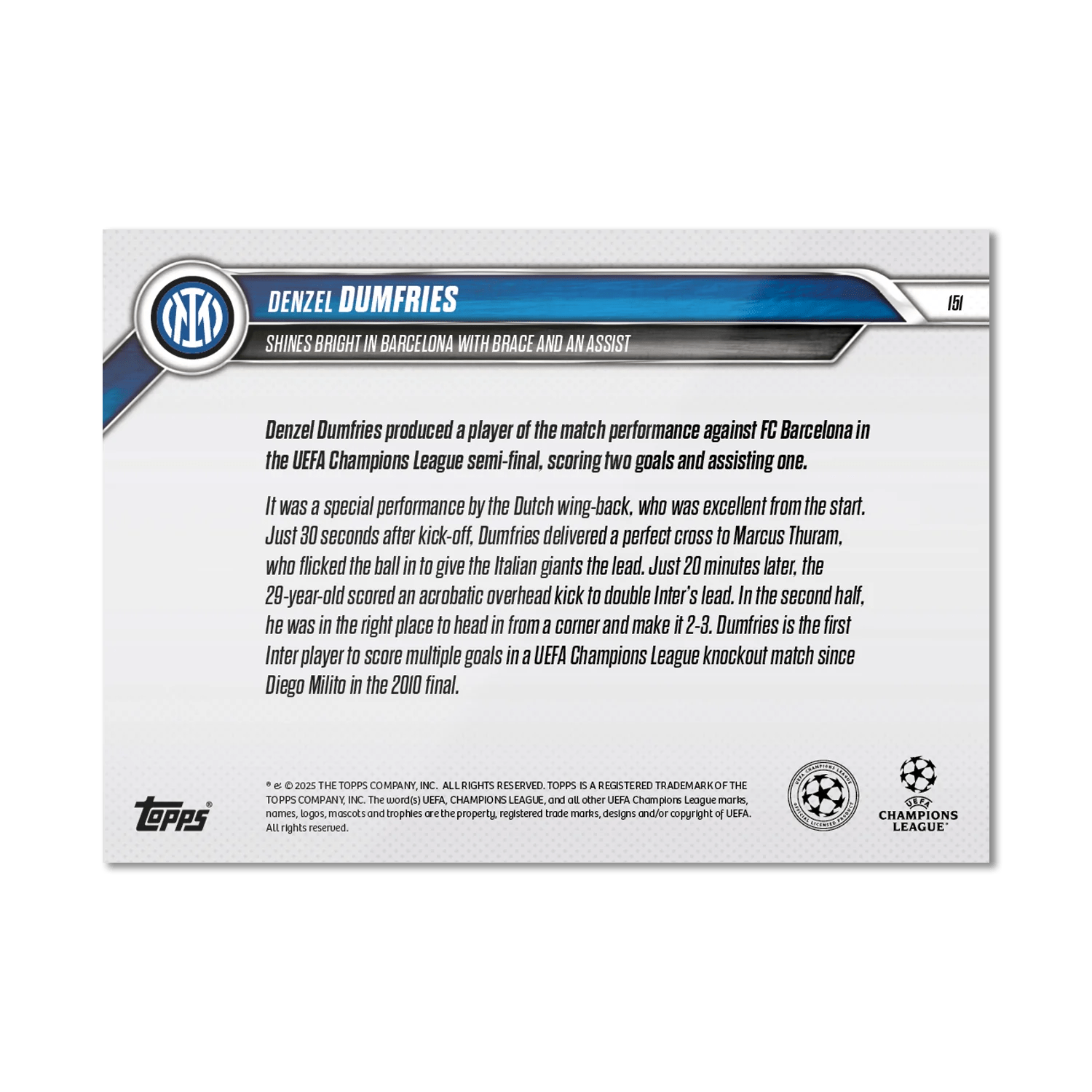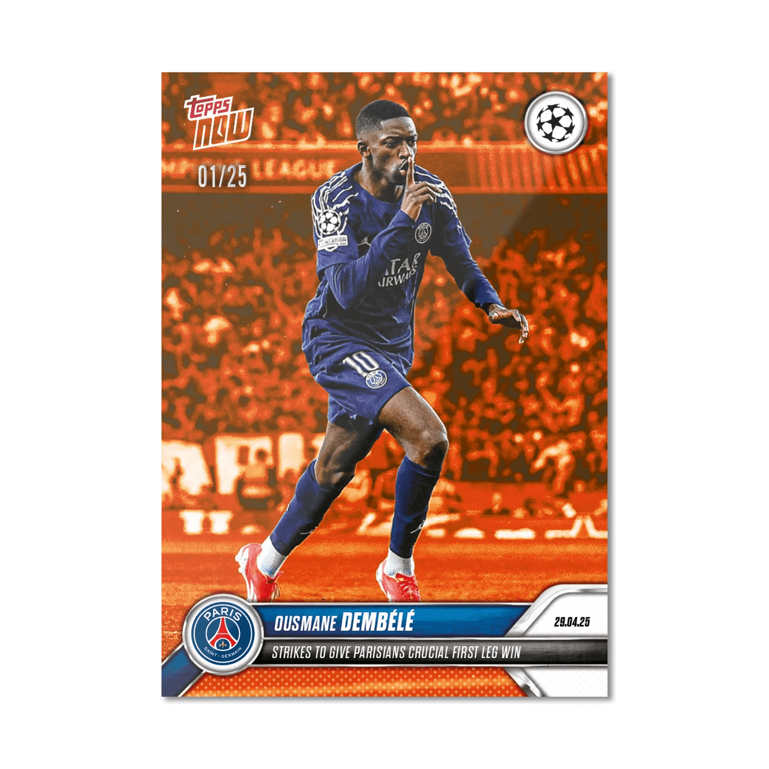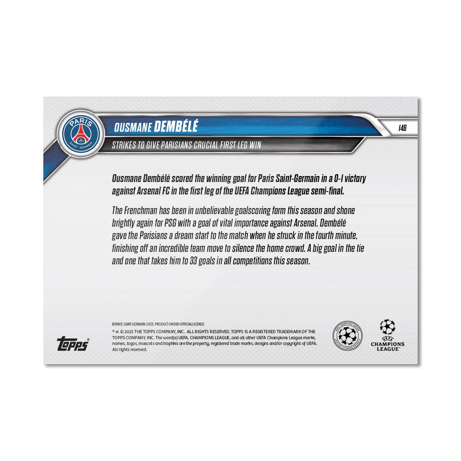 TOPPS NOW « UEFA CHAMPIONS LEAGUE 2024/25 » : visuel des cartes 146 à 151 (demi-finales aller des 29 et 30/04) Thierry K.06/05/202506/05/2025ACTUALITÉS, DÉCOUVERTE, EDITION LIMITÉE Navigation des articles PrécédentSuivant Arsenal 0 - 1 Paris-SG FC Barcelone 3 - 3 Inter Milan Partager : Imprimer(ouvre dans une nouvelle fenêtre) Imprimer Envoyer un lien par e-mail à un ami(ouvre dans une nouvelle fenêtre) E-mail Partager sur Facebook(ouvre dans une nouvelle fenêtre) Facebook Partager sur X(ouvre dans une nouvelle fenêtre) X J’aime chargement… Articles similaires